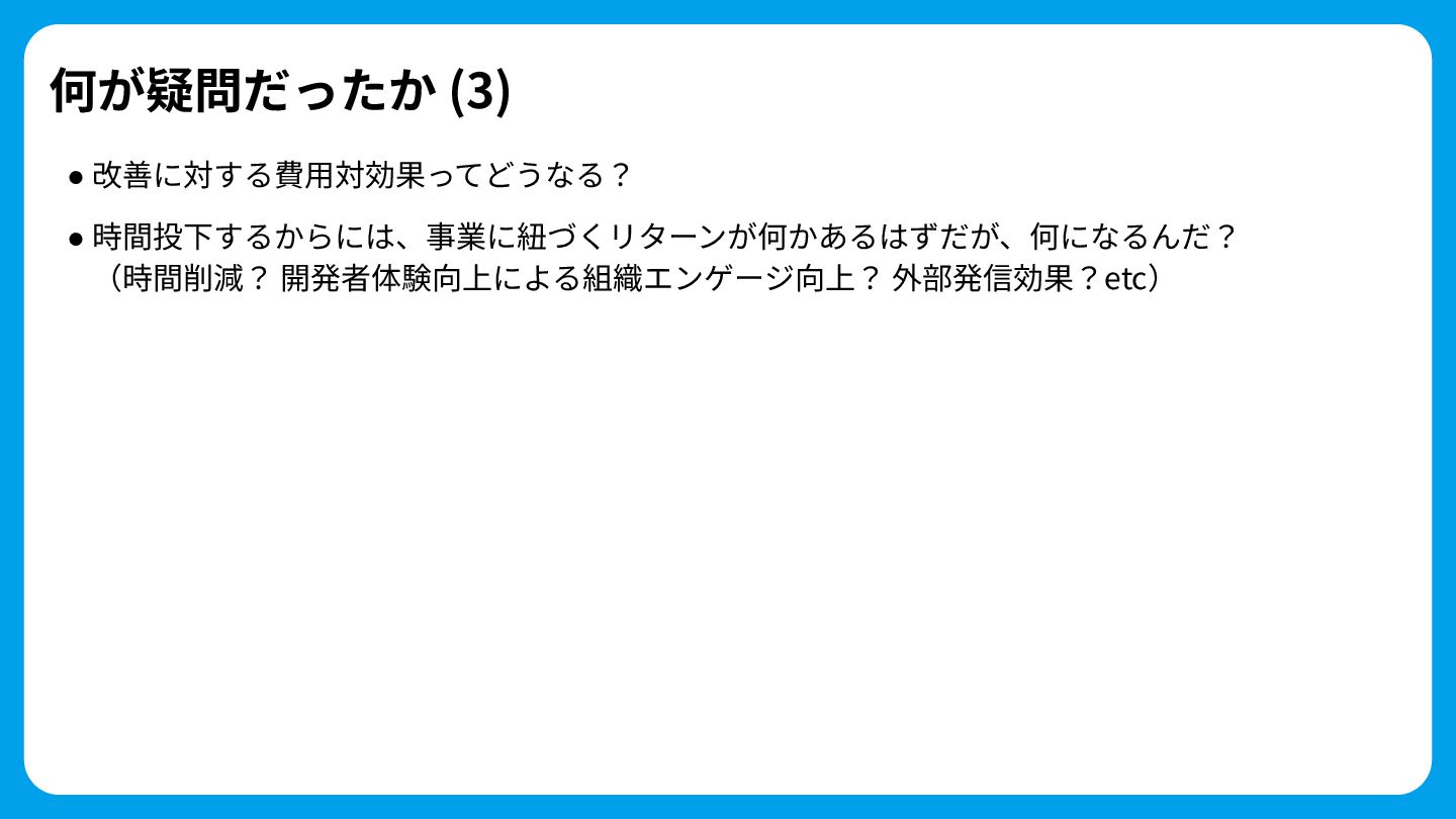 何が疑問だったか (3) • 改善に対する費⽤対効果ってどうなる? • 時間投下するからには、事業に紐づくリターンが何かあるはずだが、何になるんだ? (時間削減? 開発者体験向上による組織エンゲージ向上? 外部発信効果?etc)