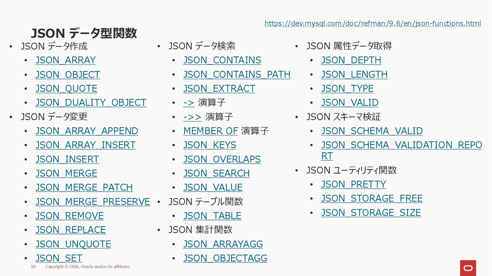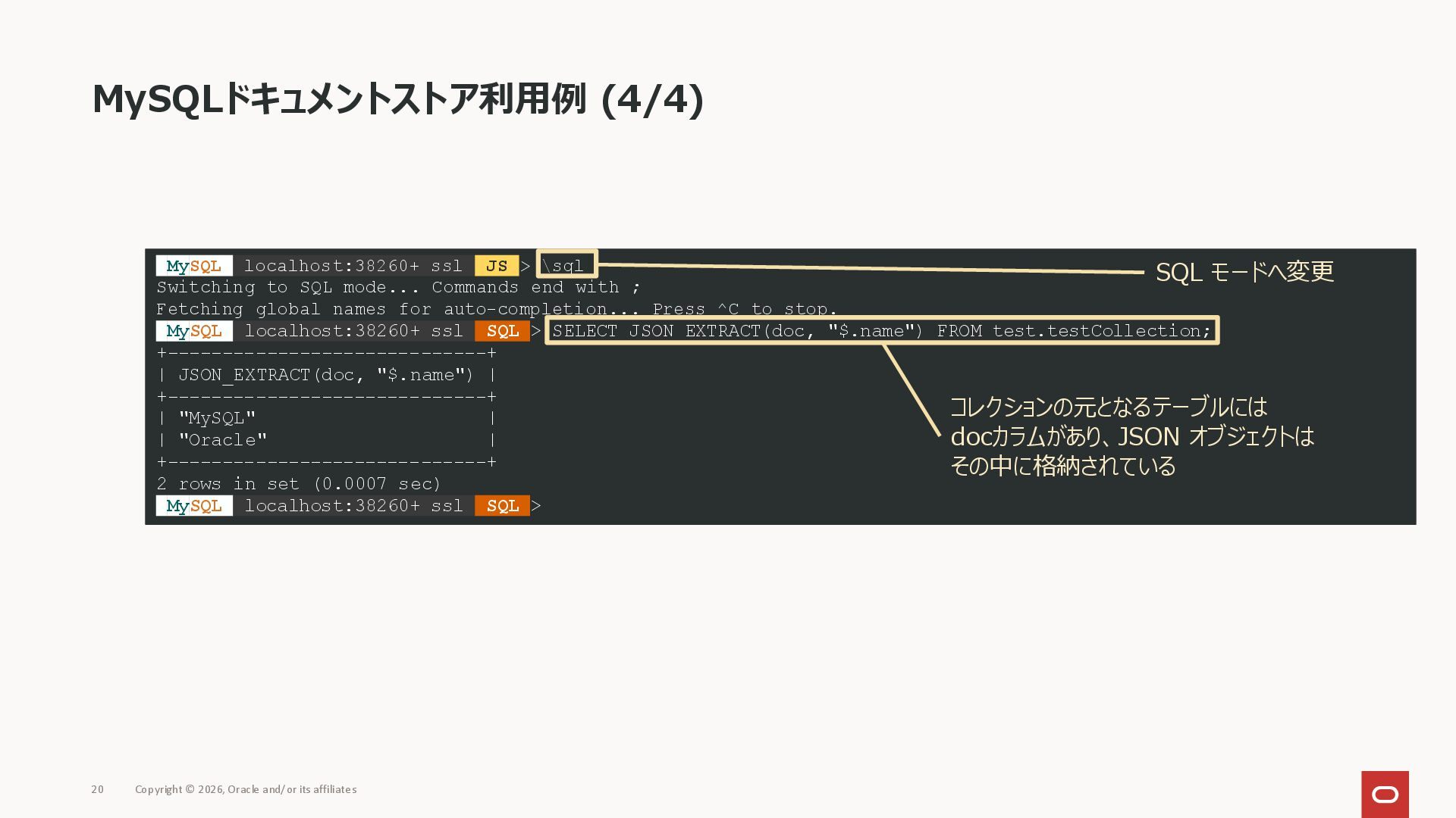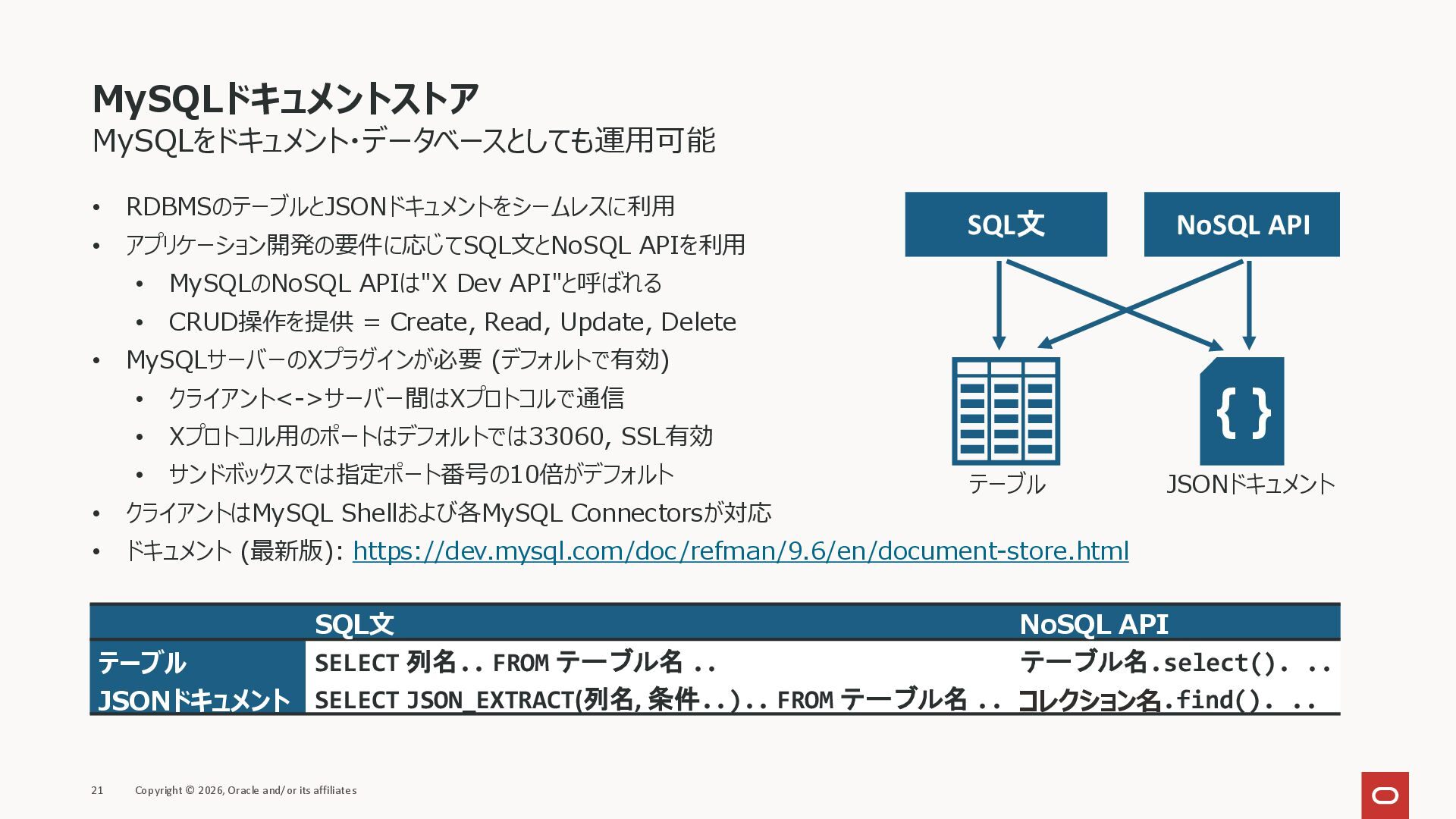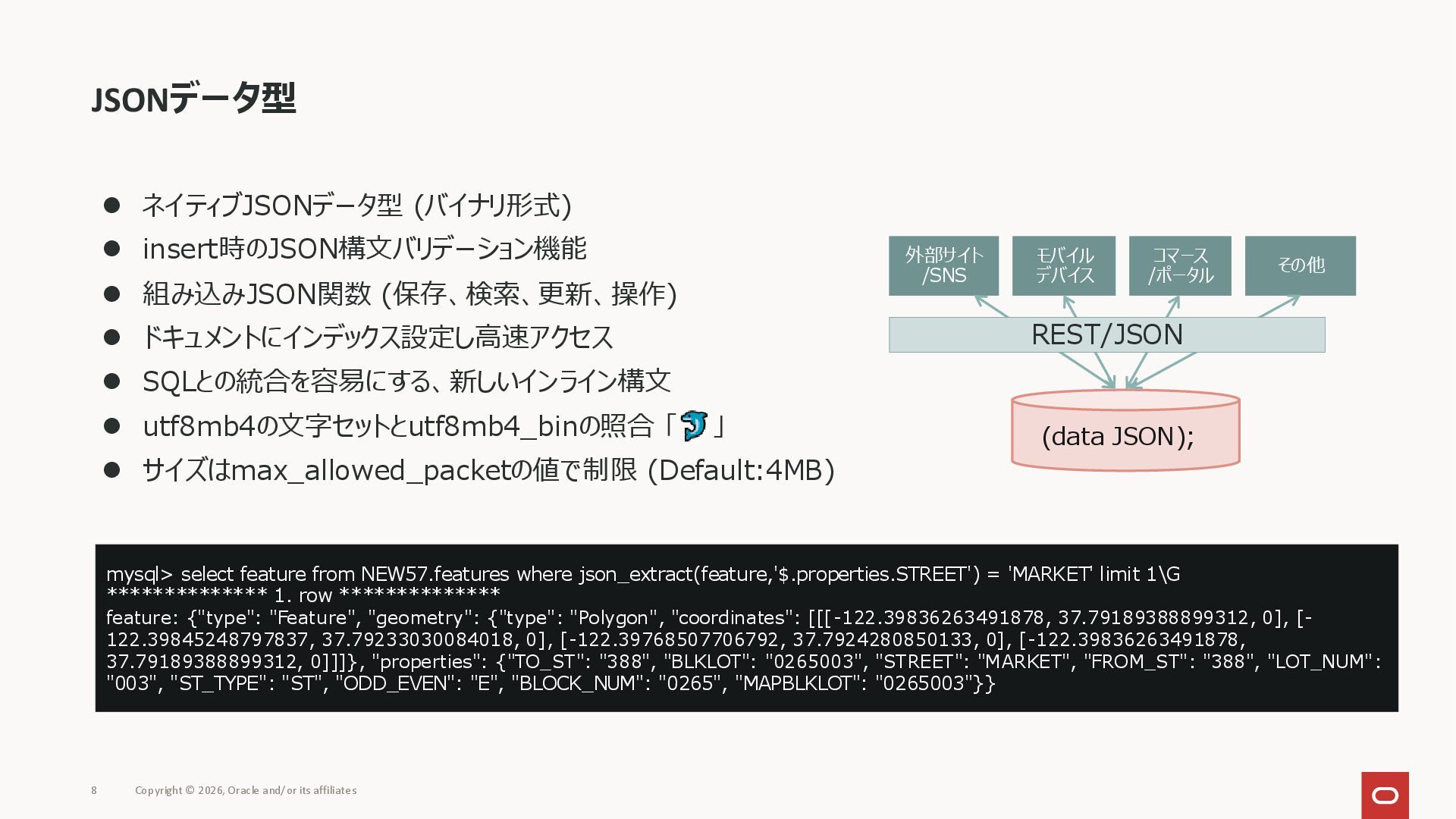 ⚫ ドキュメントにインデックス設定し高速アクセス ⚫ SQLとの統合を容易にする、新しいインライン構文 ⚫ utf8mb4の文字セットとutf8mb4_binの照合 「 」 ⚫ サイズはmax_allowed_packetの値で制限 (Default:4MB) mysql> select feature from NEW57.features where json_extract(feature,'$.properties.STREET') = 'MARKET' limit 1\G ************** 1. row ************** feature: {"type": "Feature", "geometry": {"type": "Polygon", "coordinates": [[[-122.39836263491878, 37.79189388899312, 0], [- 122.39845248797837, 37.79233030084018, 0], [-122.39768507706792, 37.7924280850133, 0], [-122.39836263491878, 37.79189388899312, 0]]]}, "properties": {"TO_ST": "388", "BLKLOT": "0265003", "STREET": "MARKET", "FROM_ST": "388", "LOT_NUM": "003", "ST_TYPE": "ST", "ODD_EVEN": "E", "BLOCK_NUM": "0265", "MAPBLKLOT": "0265003"}} 外部サイト /SNS モバイル デバイス コマース /ポータル その他 (data JSON); REST/JSON Copyright © 2026, Oracle and/or its affiliates