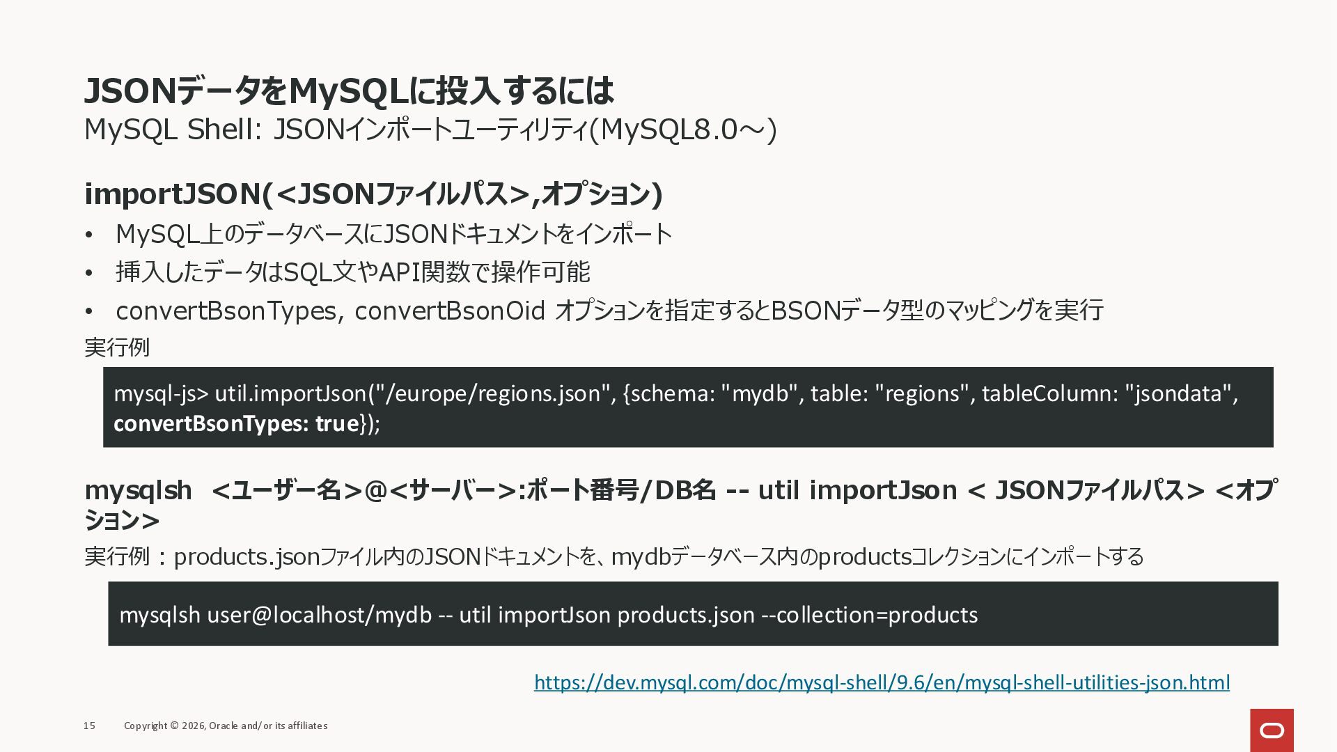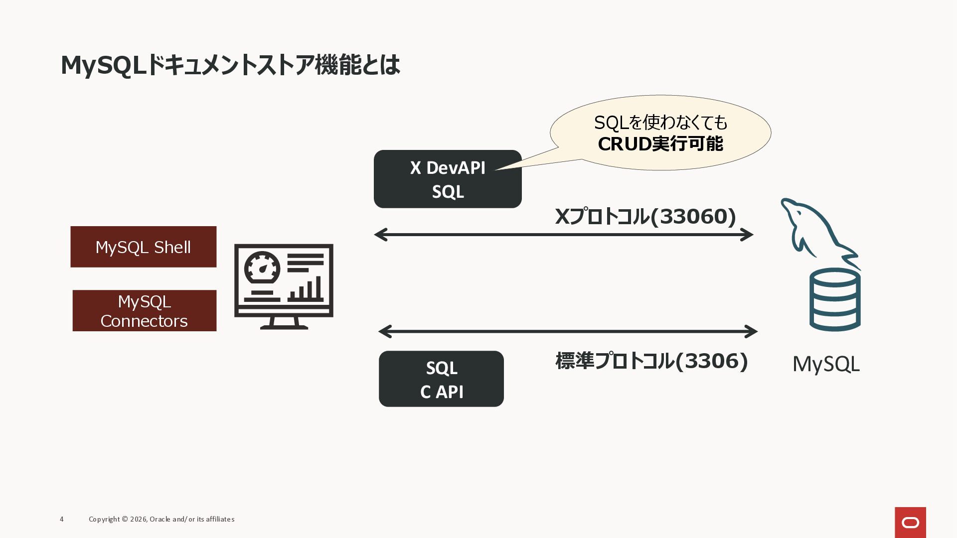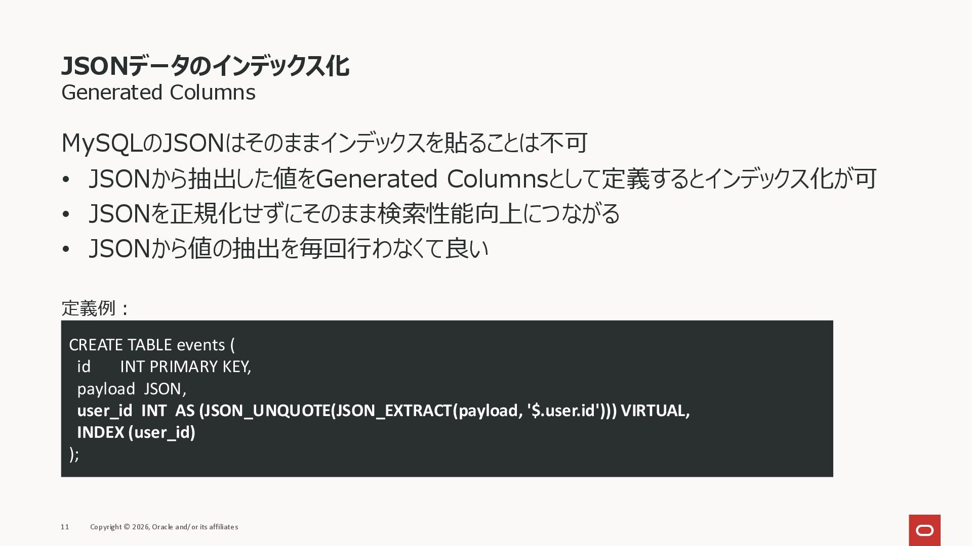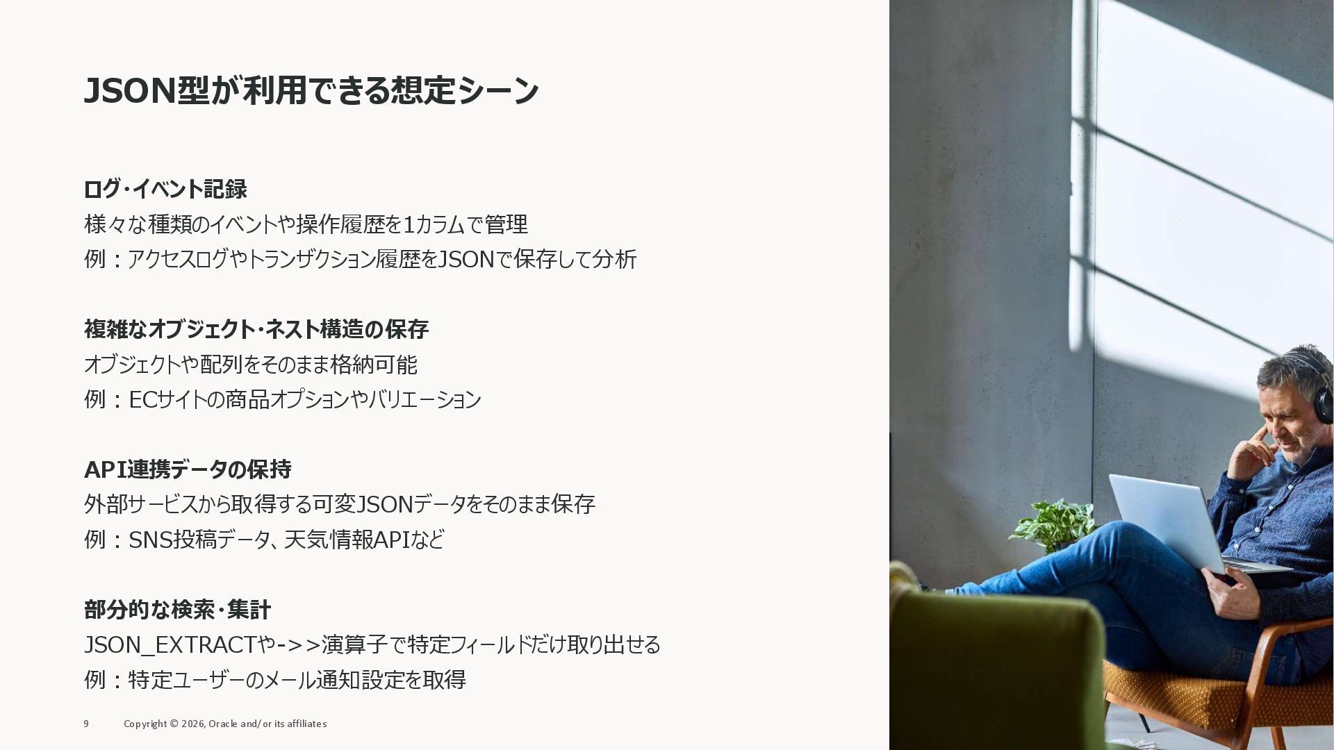 ⚫ ドキュメントにインデックス設定し高速アクセス ⚫ SQLとの統合を容易にする、新しいインライン構文 ⚫ utf8mb4の文字セットとutf8mb4_binの照合 「 」 ⚫ サイズはmax_allowed_packetの値で制限 (Default:4MB) mysql> select feature from NEW57.features where json_extract(feature,'$.properties.STREET') = 'MARKET' limit 1\G ************** 1. row ************** feature: {"type": "Feature", "geometry": {"type": "Polygon", "coordinates": [[[-122.39836263491878, 37.79189388899312, 0], [- 122.39845248797837, 37.79233030084018, 0], [-122.39768507706792, 37.7924280850133, 0], [-122.39836263491878, 37.79189388899312, 0]]]}, "properties": {"TO_ST": "388", "BLKLOT": "0265003", "STREET": "MARKET", "FROM_ST": "388", "LOT_NUM": "003", "ST_TYPE": "ST", "ODD_EVEN": "E", "BLOCK_NUM": "0265", "MAPBLKLOT": "0265003"}} 外部サイト /SNS モバイル デバイス コマース /ポータル その他 (data JSON); REST/JSON Copyright © 2026, Oracle and/or its affiliates