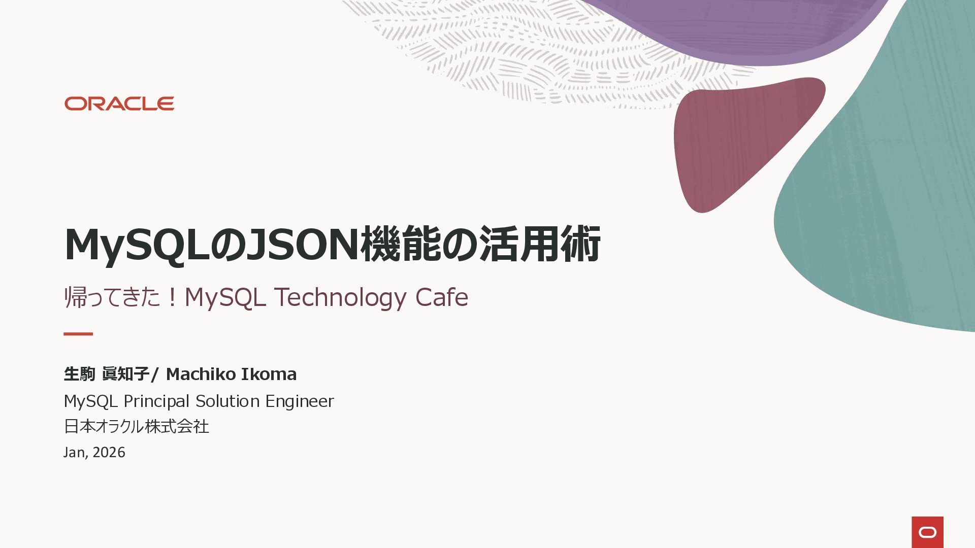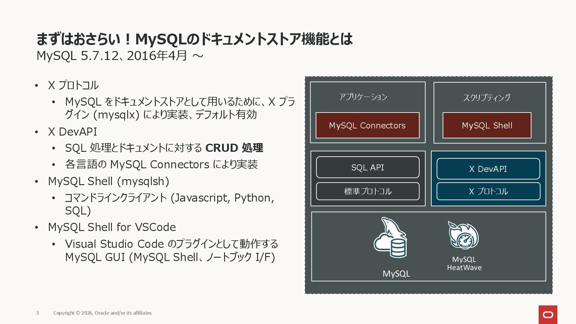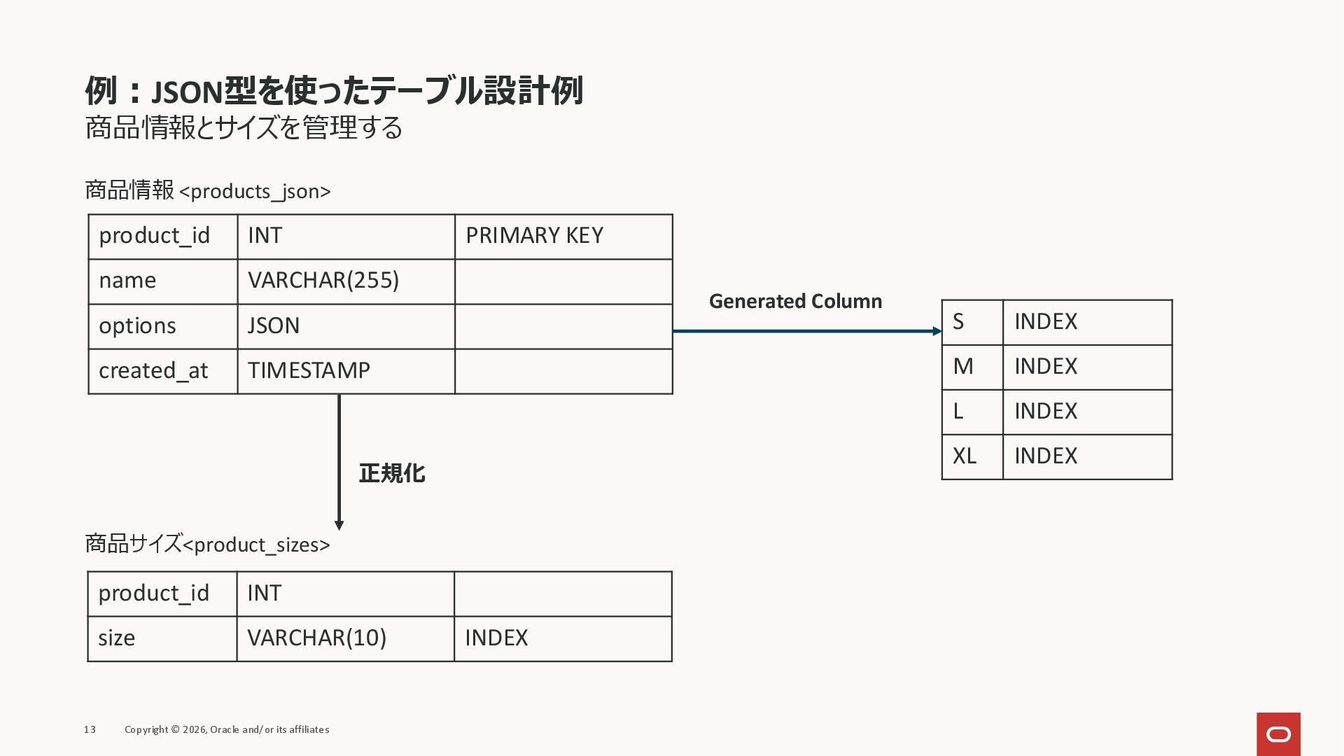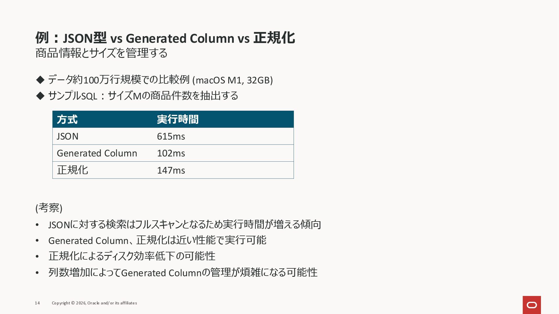 ⚫ ドキュメントにインデックス設定し高速アクセス ⚫ SQLとの統合を容易にする、新しいインライン構文 ⚫ utf8mb4の文字セットとutf8mb4_binの照合 「 」 ⚫ サイズはmax_allowed_packetの値で制限 (Default:4MB) mysql> select feature from NEW57.features where json_extract(feature,'$.properties.STREET') = 'MARKET' limit 1\G ************** 1. row ************** feature: {"type": "Feature", "geometry": {"type": "Polygon", "coordinates": [[[-122.39836263491878, 37.79189388899312, 0], [- 122.39845248797837, 37.79233030084018, 0], [-122.39768507706792, 37.7924280850133, 0], [-122.39836263491878, 37.79189388899312, 0]]]}, "properties": {"TO_ST": "388", "BLKLOT": "0265003", "STREET": "MARKET", "FROM_ST": "388", "LOT_NUM": "003", "ST_TYPE": "ST", "ODD_EVEN": "E", "BLOCK_NUM": "0265", "MAPBLKLOT": "0265003"}} 外部サイト /SNS モバイル デバイス コマース /ポータル その他 (data JSON); REST/JSON Copyright © 2026, Oracle and/or its affiliates