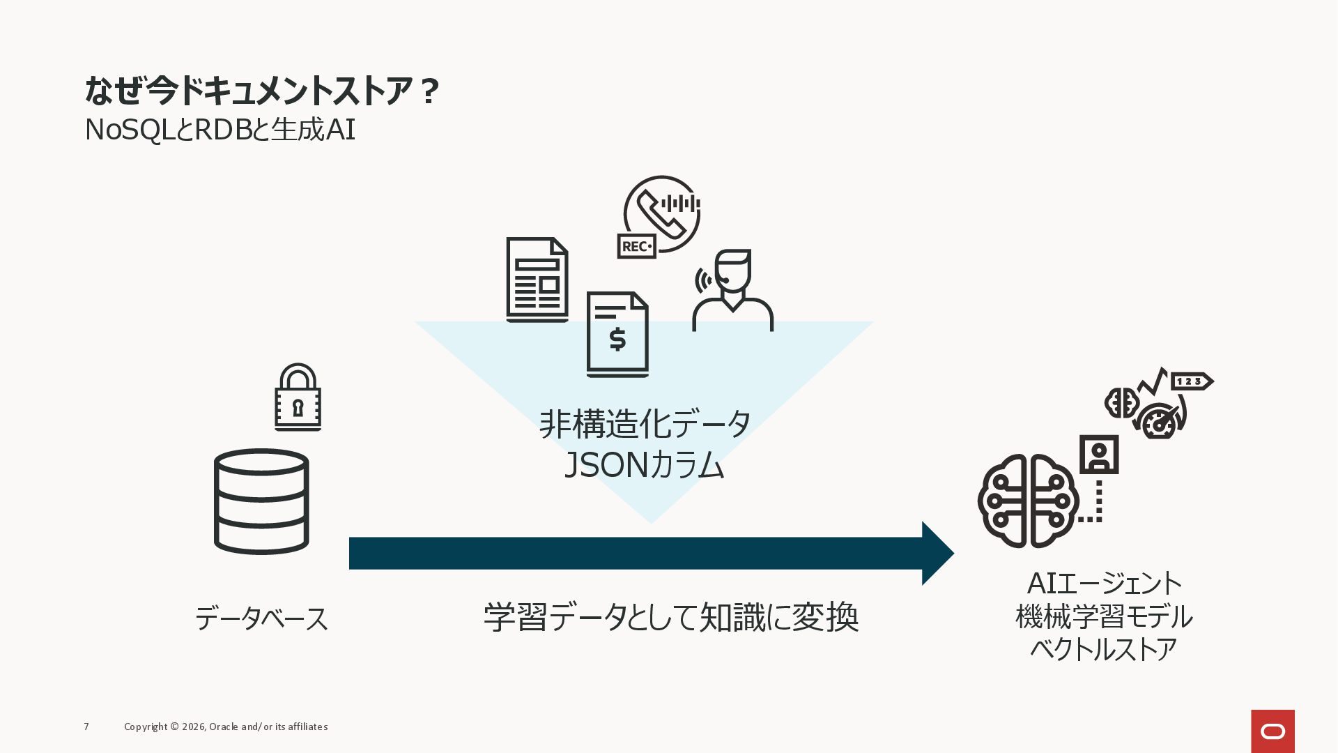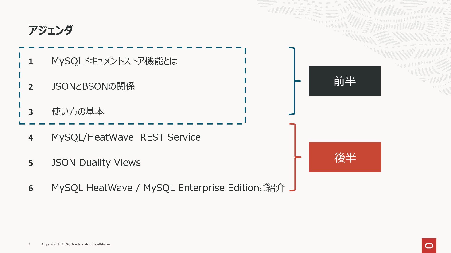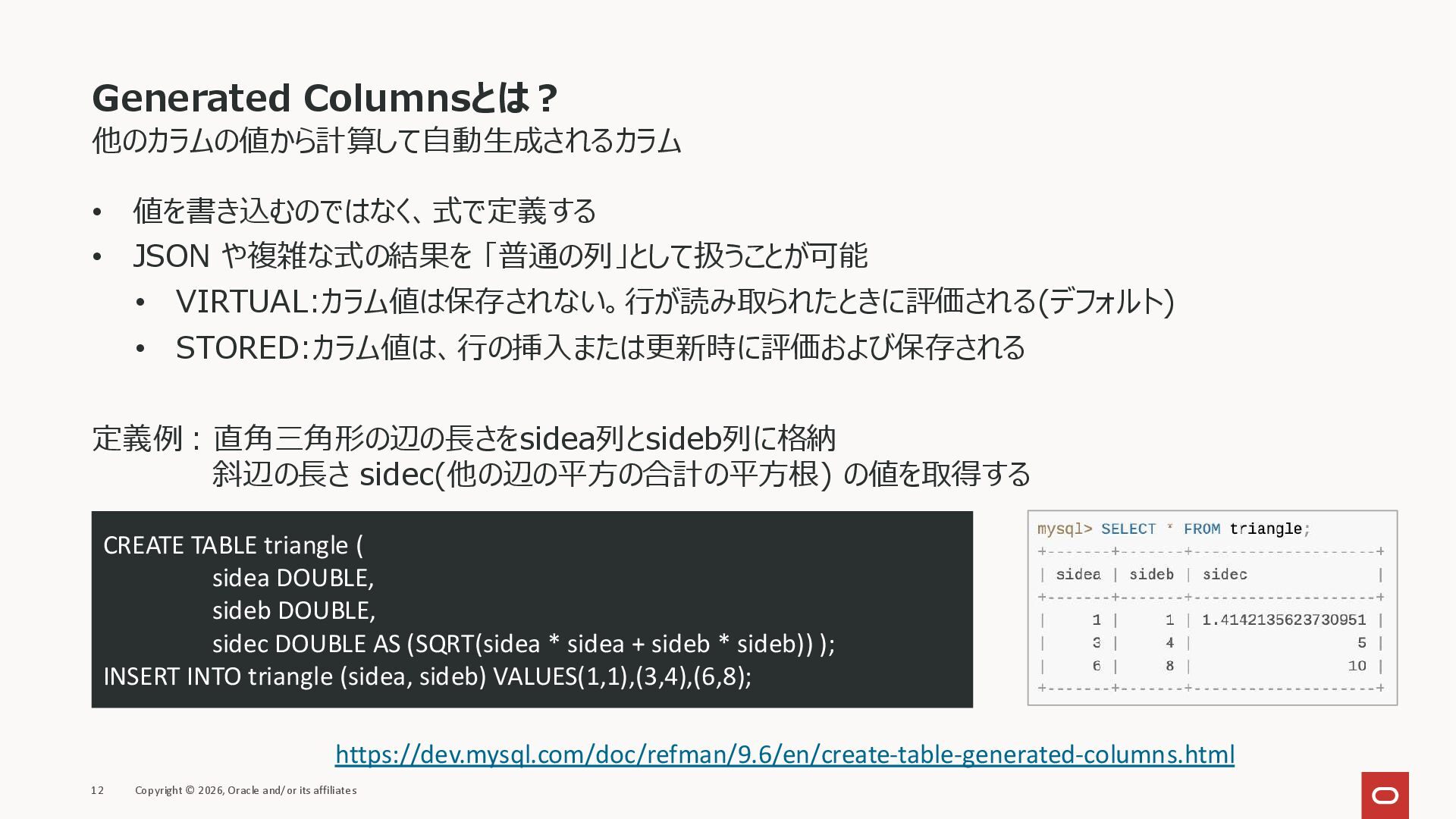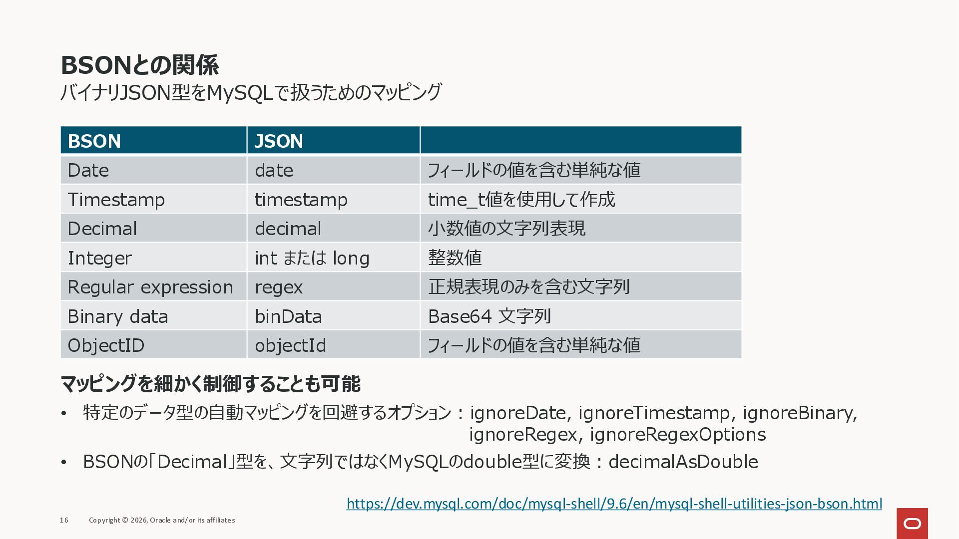 ⚫ ドキュメントにインデックス設定し高速アクセス ⚫ SQLとの統合を容易にする、新しいインライン構文 ⚫ utf8mb4の文字セットとutf8mb4_binの照合 「 」 ⚫ サイズはmax_allowed_packetの値で制限 (Default:4MB) mysql> select feature from NEW57.features where json_extract(feature,'$.properties.STREET') = 'MARKET' limit 1\G ************** 1. row ************** feature: {"type": "Feature", "geometry": {"type": "Polygon", "coordinates": [[[-122.39836263491878, 37.79189388899312, 0], [- 122.39845248797837, 37.79233030084018, 0], [-122.39768507706792, 37.7924280850133, 0], [-122.39836263491878, 37.79189388899312, 0]]]}, "properties": {"TO_ST": "388", "BLKLOT": "0265003", "STREET": "MARKET", "FROM_ST": "388", "LOT_NUM": "003", "ST_TYPE": "ST", "ODD_EVEN": "E", "BLOCK_NUM": "0265", "MAPBLKLOT": "0265003"}} 外部サイト /SNS モバイル デバイス コマース /ポータル その他 (data JSON); REST/JSON Copyright © 2026, Oracle and/or its affiliates