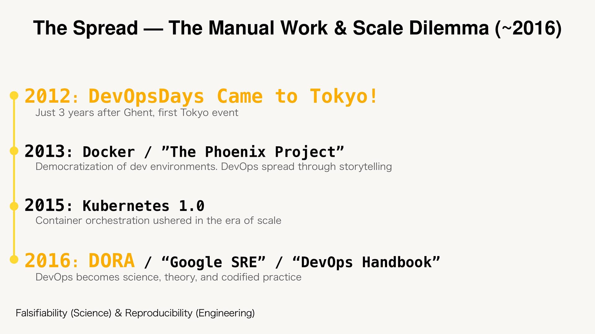 2012: DevOpsDays Came to Tokyo! +VTUZFBSTBGUFS(IFOU  fi STU5PLZPFWFOU 2013: Docker / ”The Phoenix Project” %FNPDSBUJ[BUJPOPGEFWFOWJSPONFOUT%FW0QTTQSFBEUISPVHITUPSZUFMMJOH 2015: Kubernetes 1.0 $POUBJOFSPSDIFTUSBUJPOVTIFSFEJOUIFFSBPGTDBMF 2016: DORA / “Google SRE” / “DevOps Handbook” %FW0QTCFDPNFTTDJFODF UIFPSZ BOEDPEJ fi FEQSBDUJDF 'BMTJGJBCJMJUZ 4DJFODF 3FQSPEVDJCJMJUZ &OHJOFFSJOH
