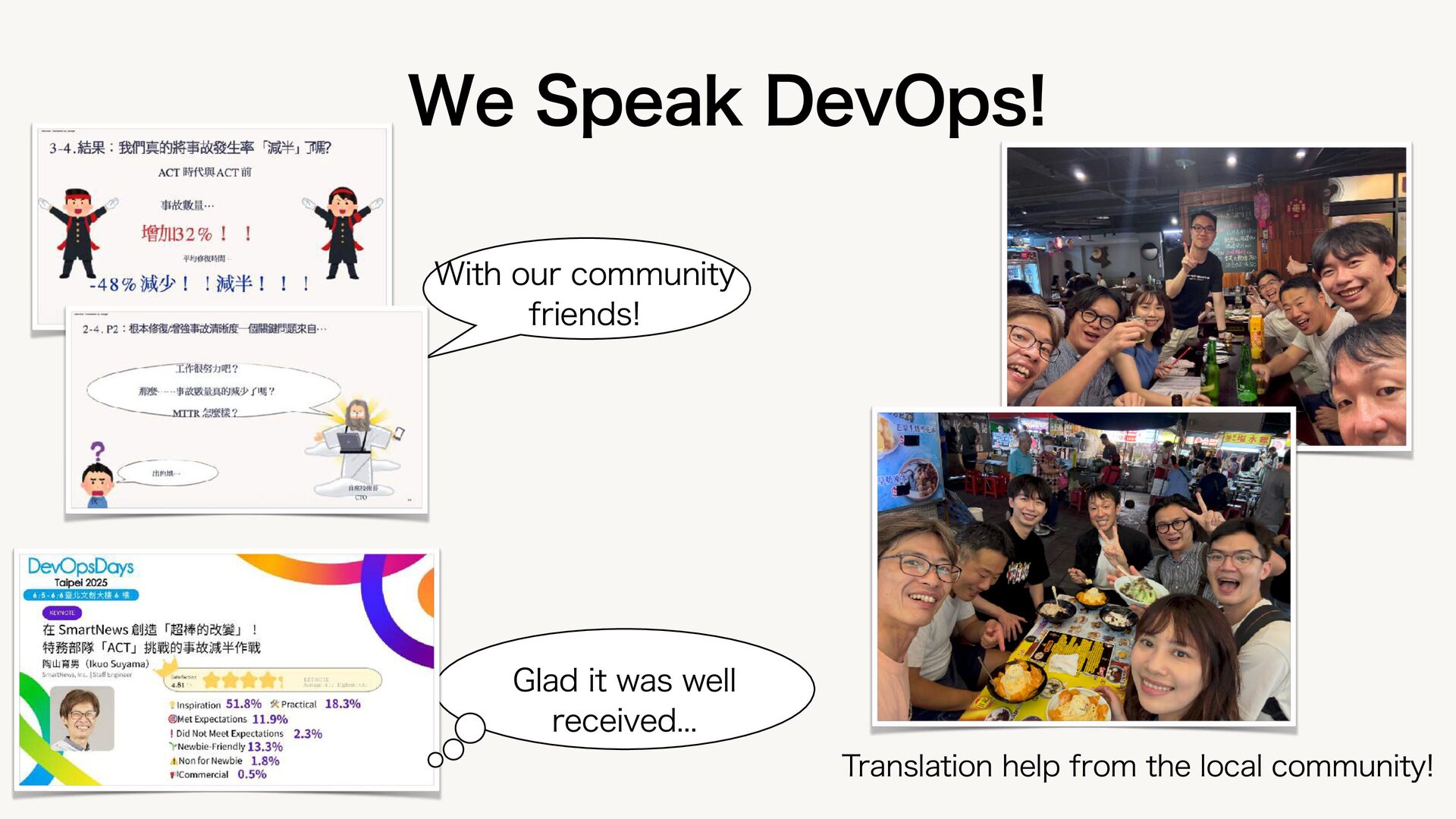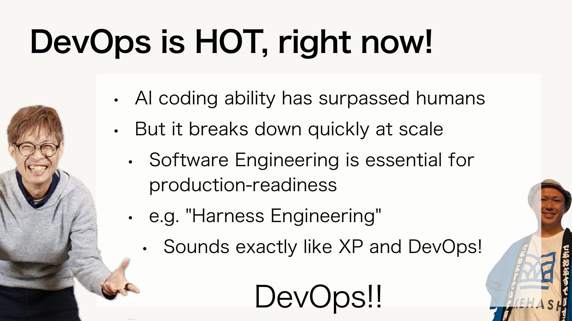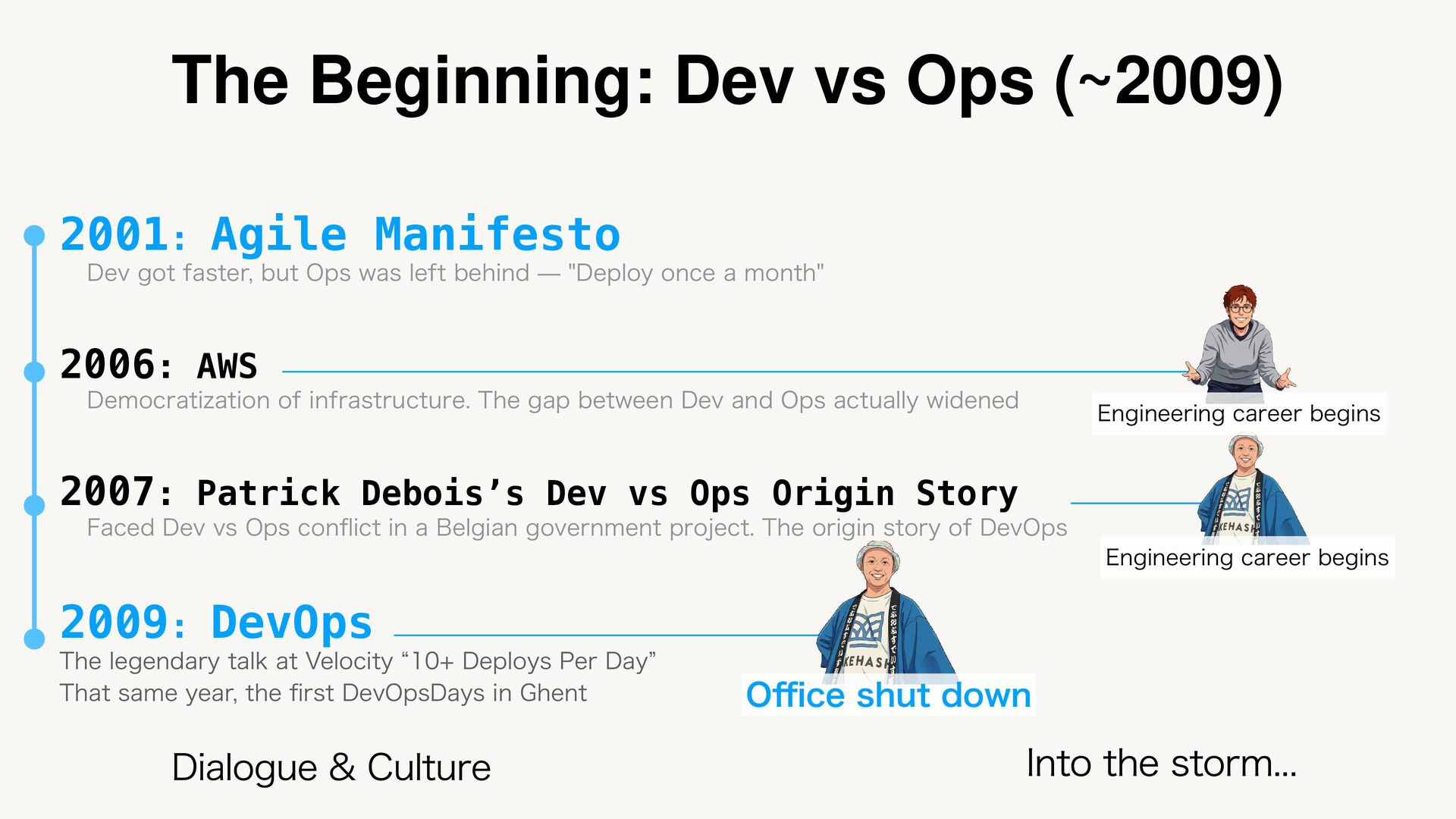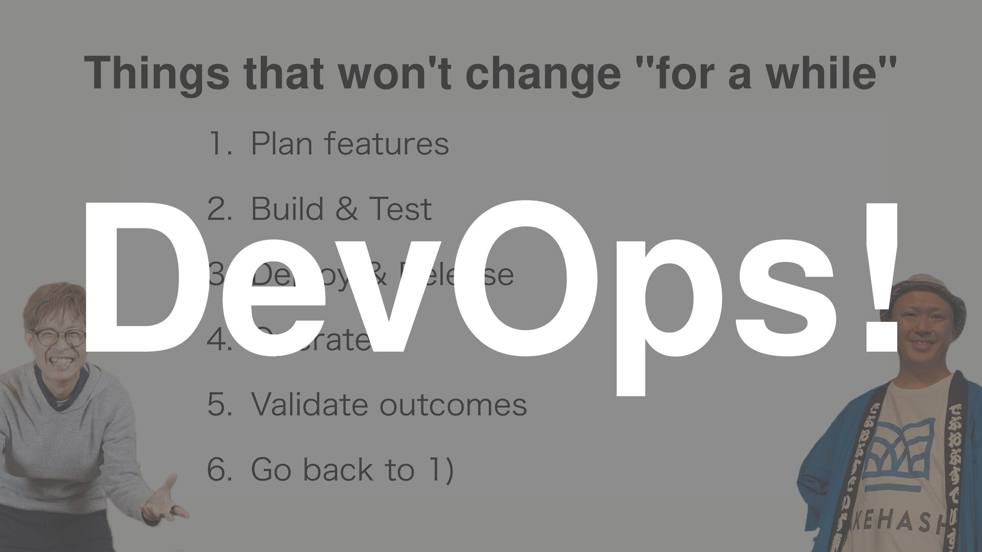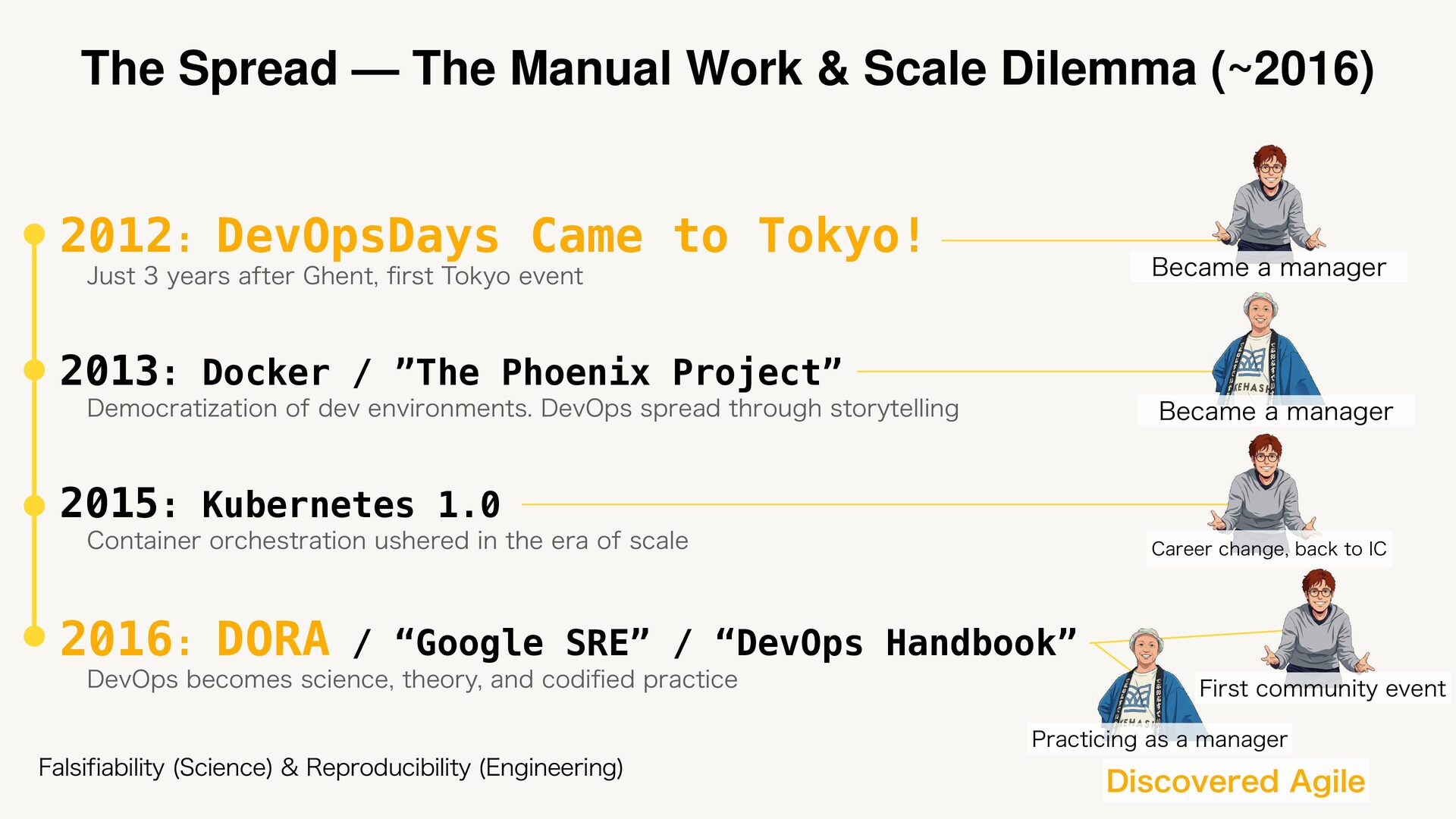 2012: DevOpsDays Came to Tokyo! +VTUZFBSTBGUFS(IFOU  fi STU5PLZPFWFOU 2013: Docker / ”The Phoenix Project” %FNPDSBUJ[BUJPOPGEFWFOWJSPONFOUT%FW0QTTQSFBEUISPVHITUPSZUFMMJOH 2015: Kubernetes 1.0 $POUBJOFSPSDIFTUSBUJPOVTIFSFEJOUIFFSBPGTDBMF 2016: DORA / “Google SRE” / “DevOps Handbook” %FW0QTCFDPNFTTDJFODF UIFPSZ BOEDPEJ fi FEQSBDUJDF 'BMTJGJBCJMJUZ 4DJFODF 3FQSPEVDJCJMJUZ &OHJOFFSJOH 'JSTUDPNNVOJUZFWFOU $BSFFSDIBOHF CBDLUP*$ #FDBNFBNBOBHFS #FDBNFBNBOBHFS %JTDPWFSFE"HJMF 1SBDUJDJOHBTBNBOBHFS