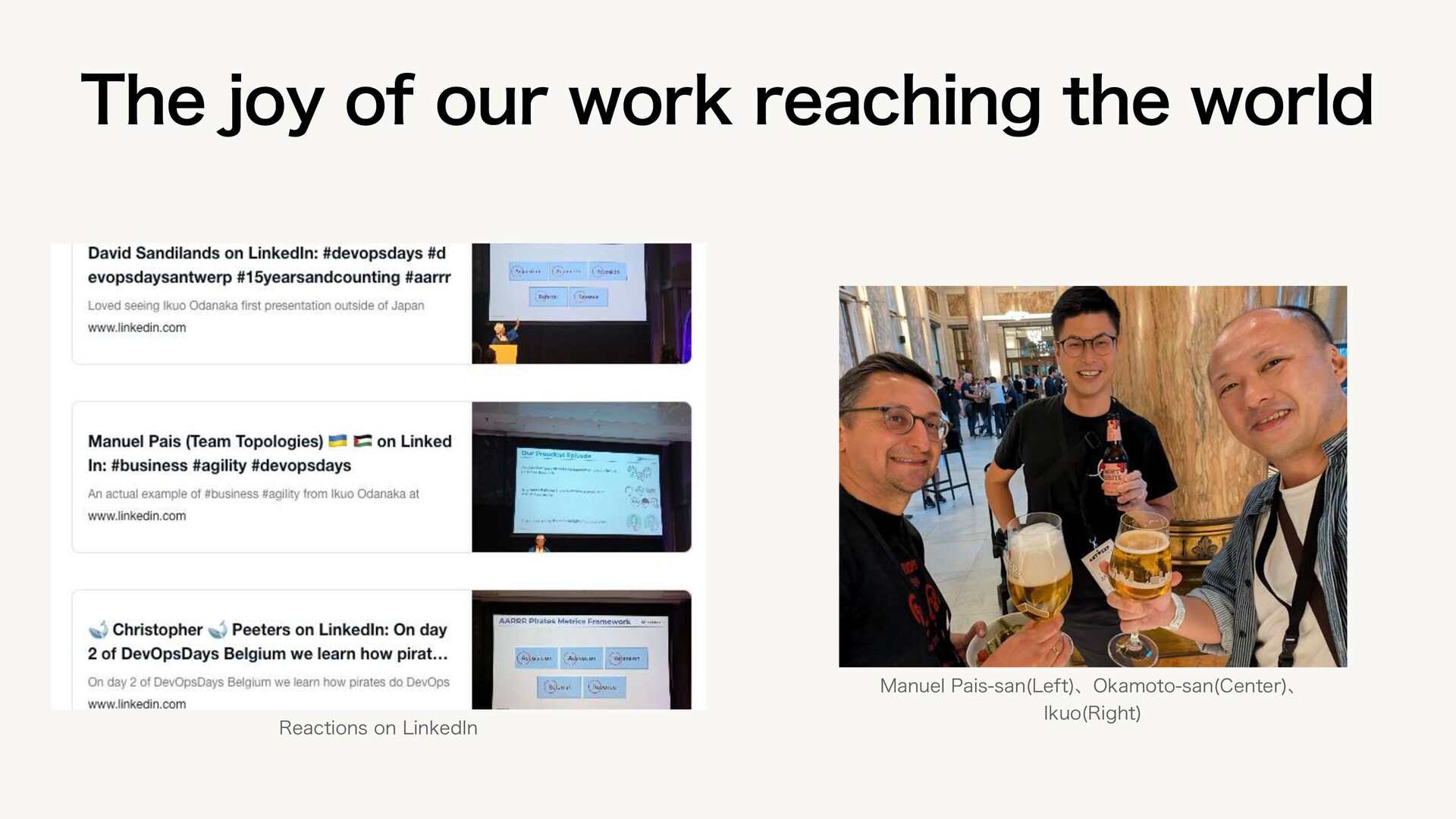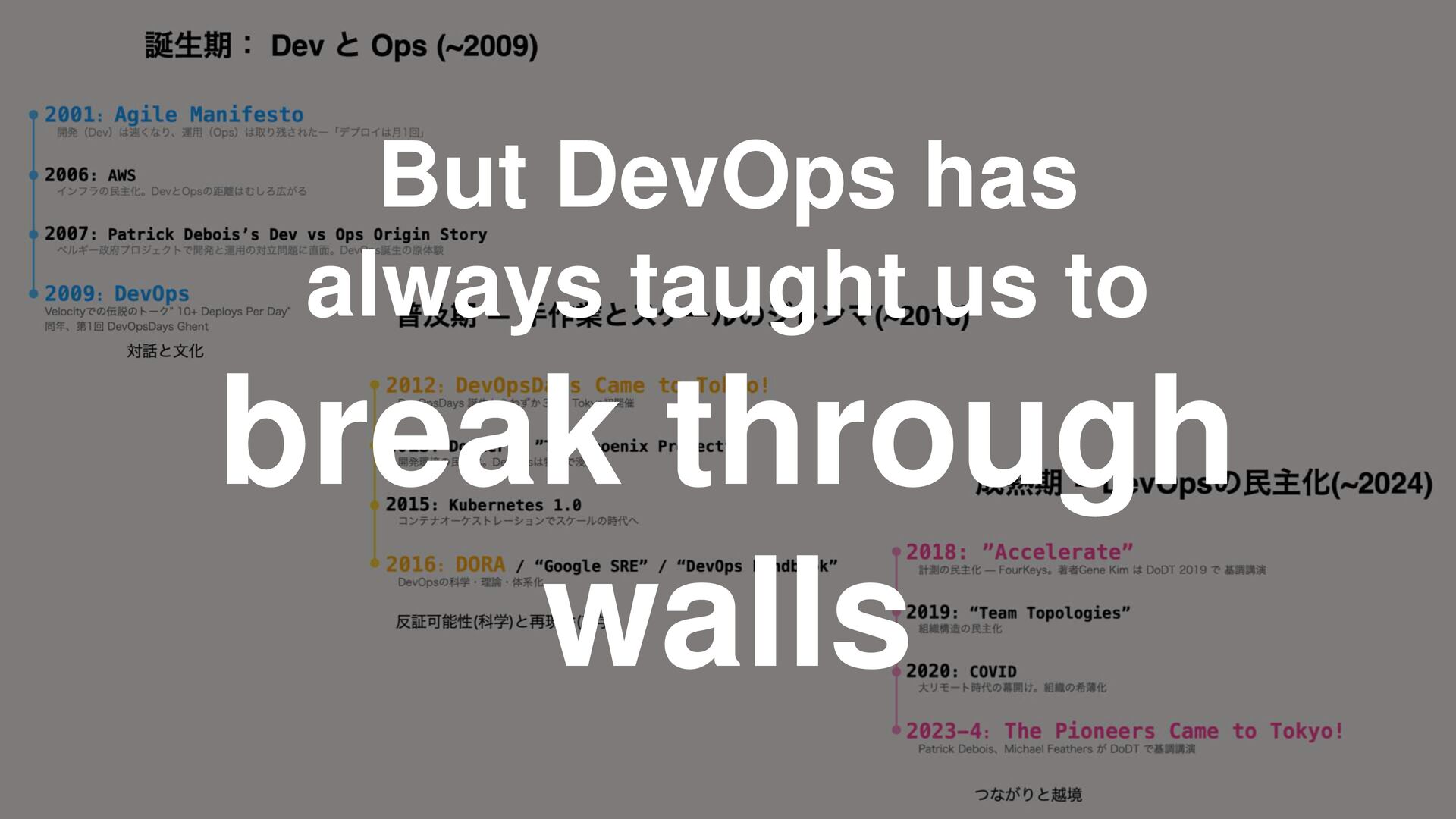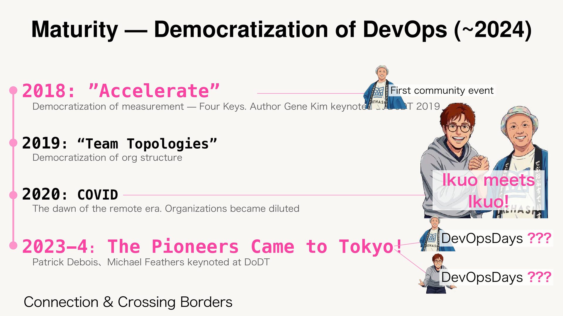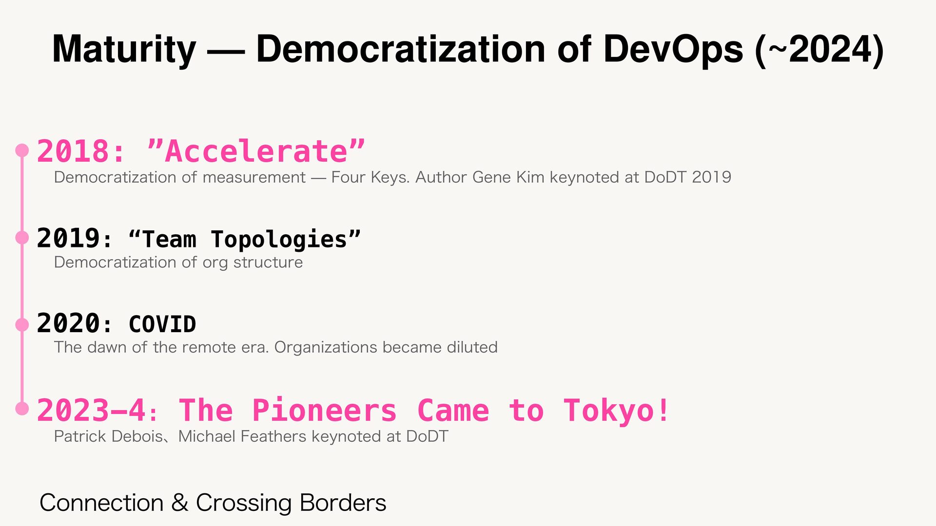 2019: “Team Topologies” %FNPDSBUJ[BUJPOPGPSHTUSVDUVSF 2020: COVID 5IFEBXOPGUIFSFNPUFFSB0SHBOJ[BUJPOTCFDBNFEJMVUFE 2023-4: The Pioneers Came to Tokyo! 1BUSJDL%FCPJTɺ.JDIBFM'FBUIFSTLFZOPUFEBU%P%5 *LVPNFFUT *LVP %FW0QT%BZT %FW0QT%BZT 'JSTUDPNNVOJUZFWFOU