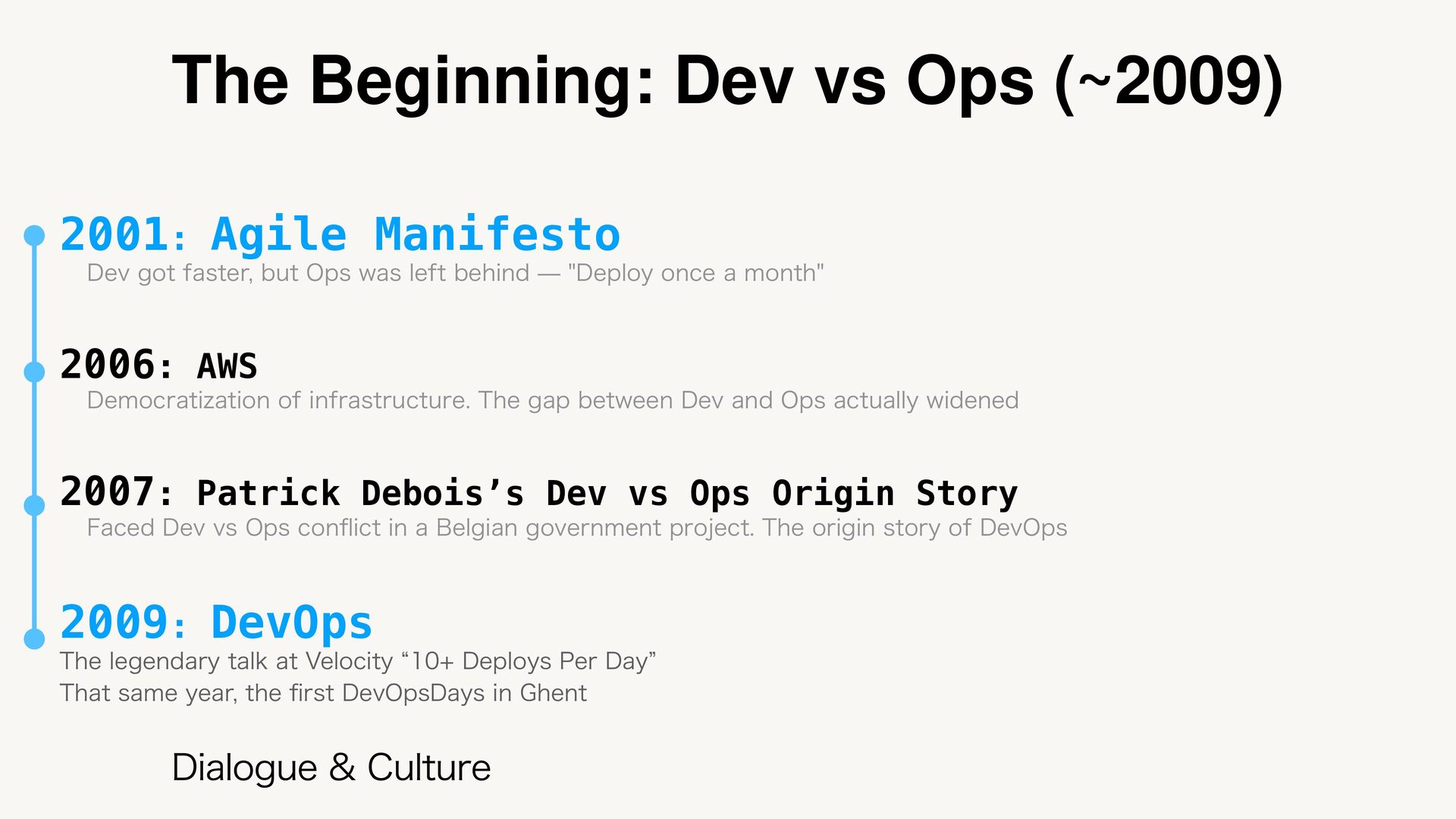 3. The Beginning: Dev vs Ops (~2009) %JBMPHVF$VMUVSF 2001: Agile Manifesto