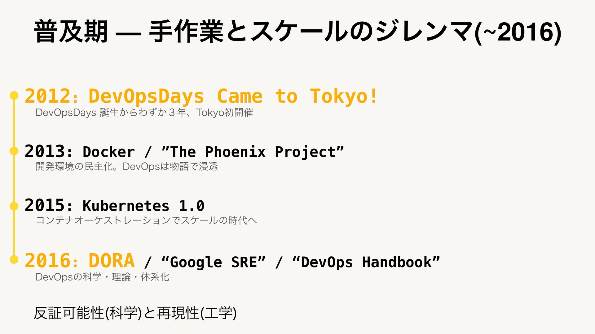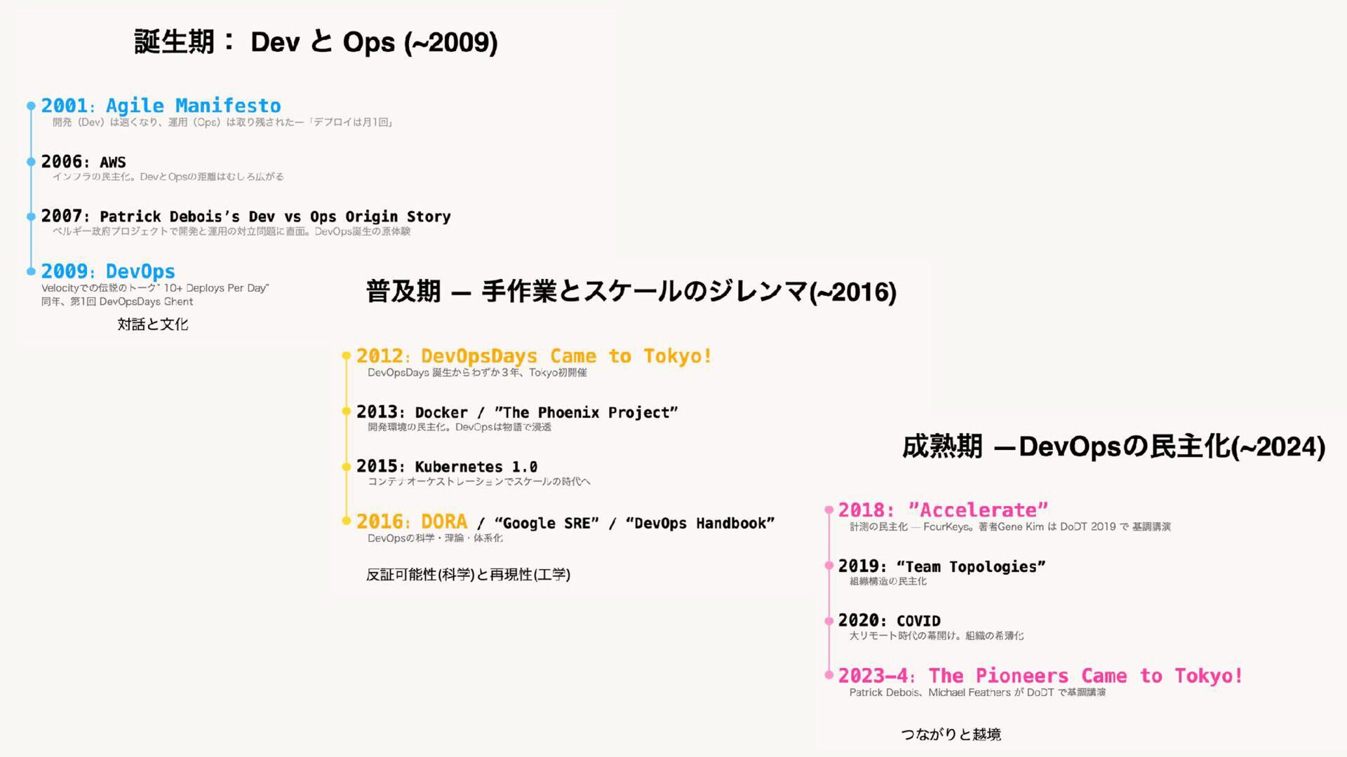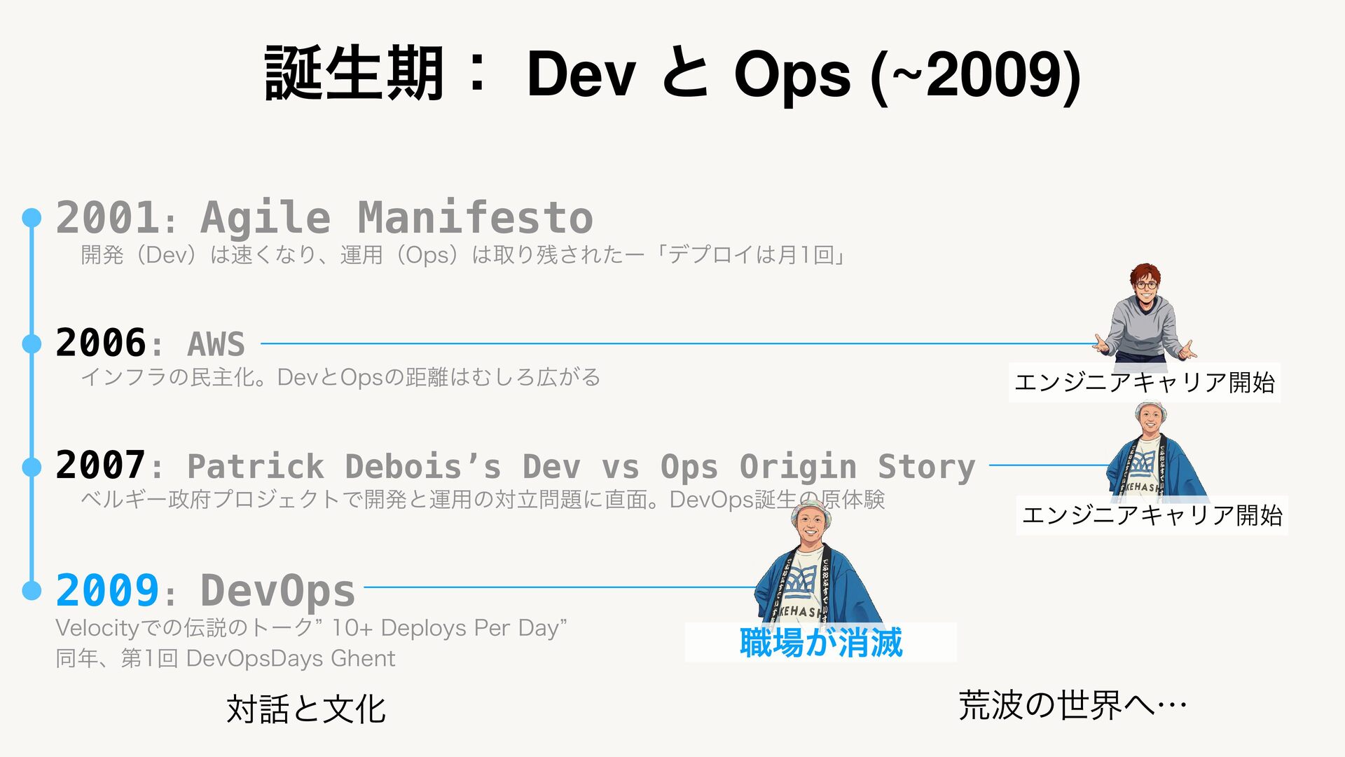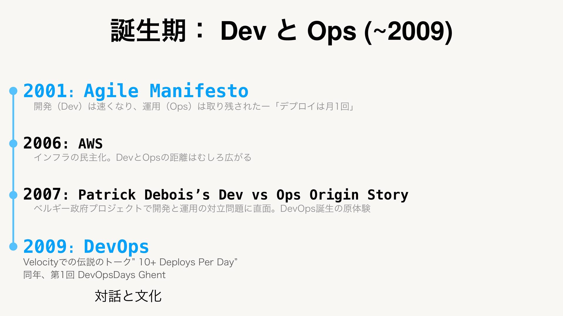 2006: AWS ΠϯϑϥͷຽओԽɻ%FWͱ0QTͷڑΉ͠Ζ͕Δ 2007: Patrick Debois’s Dev vs Ops Origin Story ϕϧΪʔϓϩδΣΫτͰ։ൃͱӡ༻ͷରཱʹ໘ɻ%FW0QTੜͷݪମݧ 2009: DevOps 7FMPDJUZͰͷઆͷτʔΫz %FQMPZT1FS%BZz ಉɺୈճ%FW0QT%BZT(IFOU