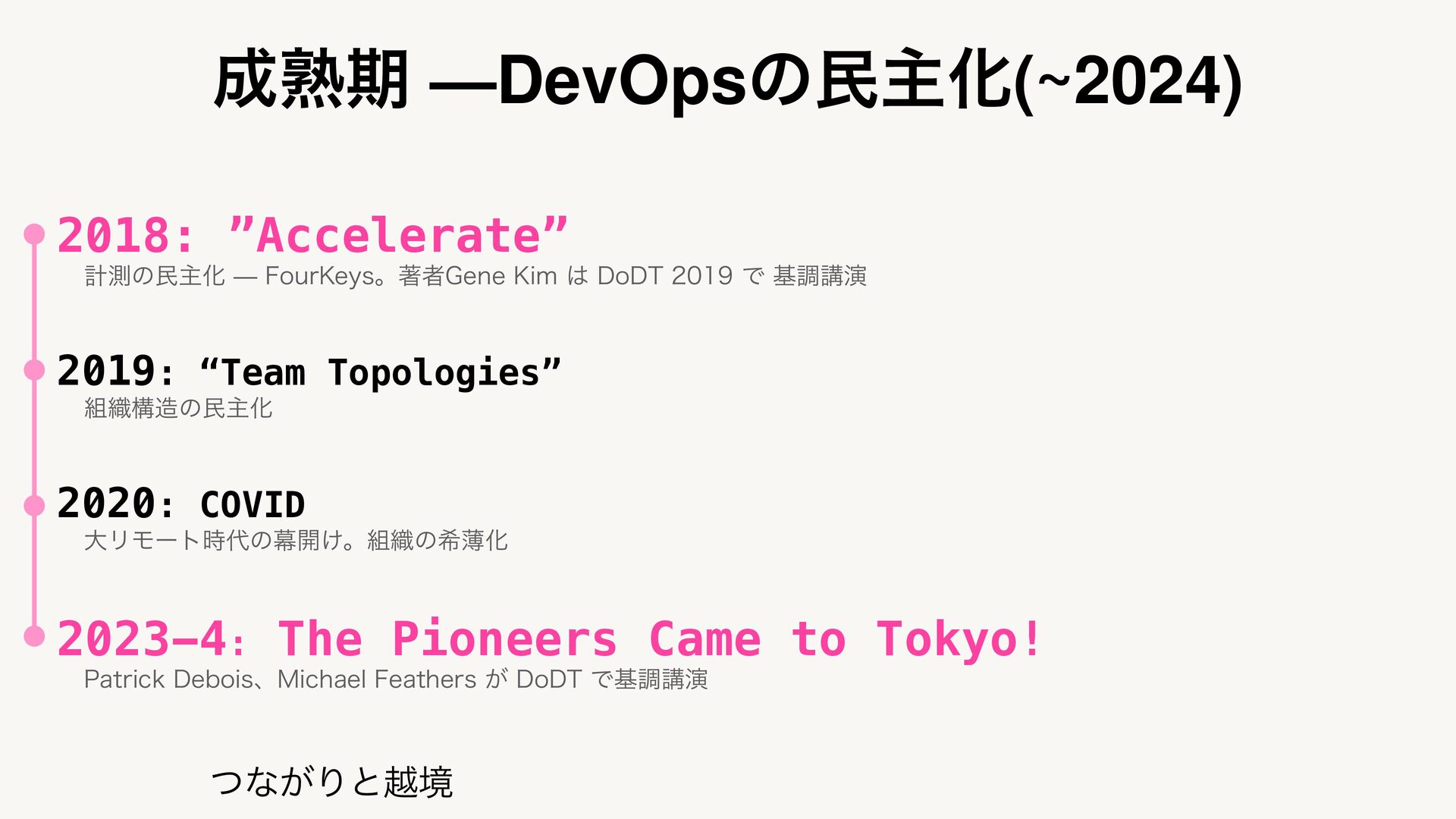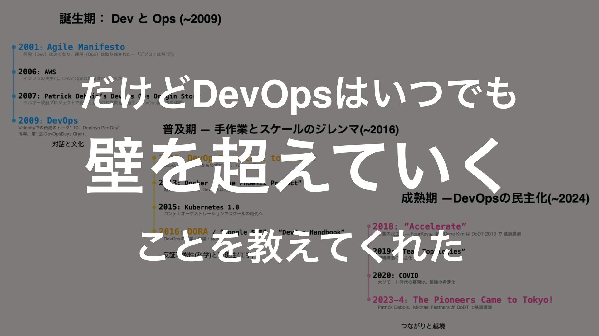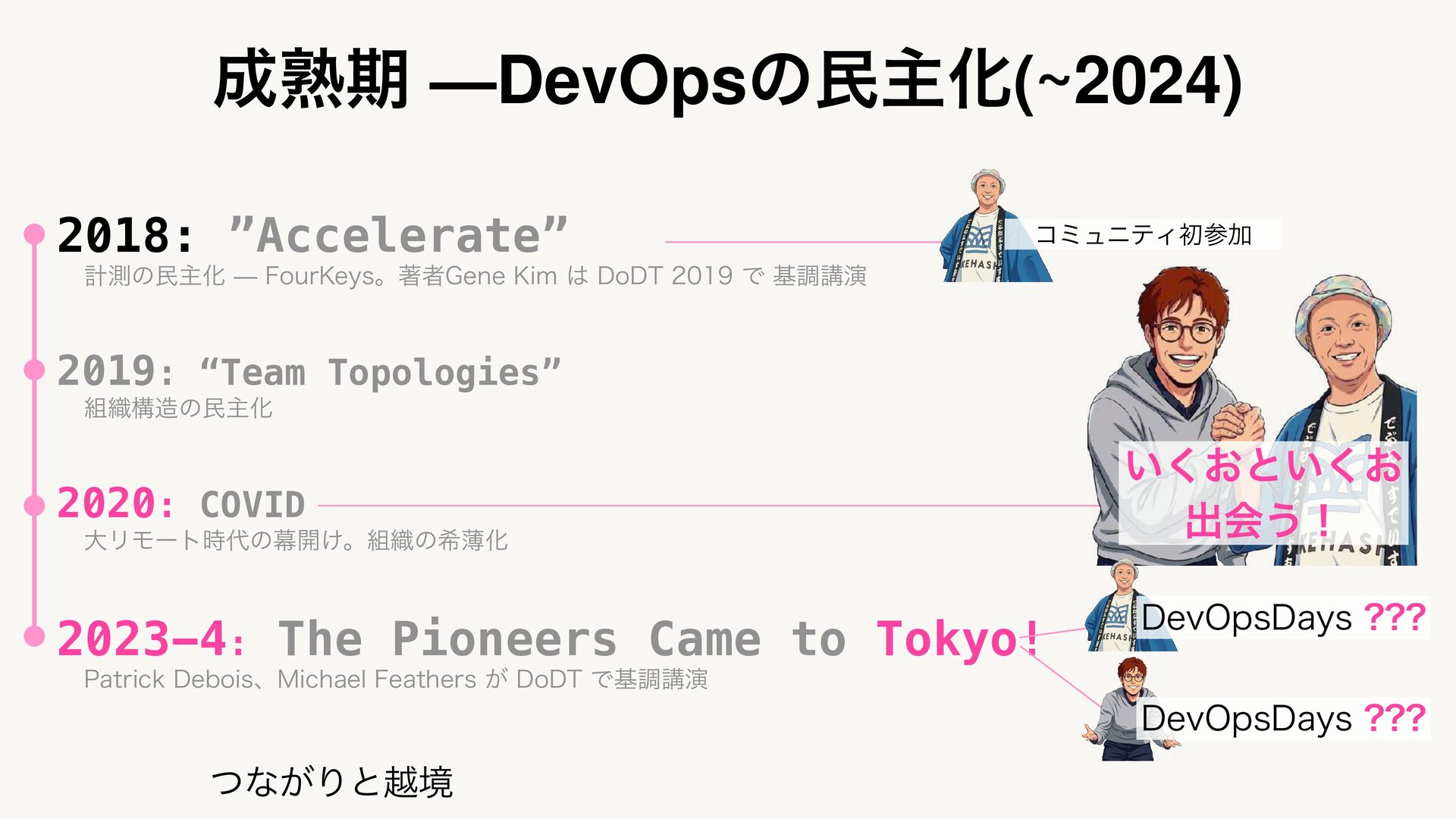 2023-4: The Pioneers Came to Tokyo! 1BUSJDL%FCPJTɺ.JDIBFM'FBUIFST͕%P%5Ͱجௐߨԋ ͭͳ͕Γͱӽڥ ͍͓͘ͱ͍͓͘ ग़ձ͏ʂ %FW0QT%BZT %FW0QT%BZT ίϛϡχςΟॳࢀՃ ख़ظ —DevOpsͷຽओԽ(~2024)