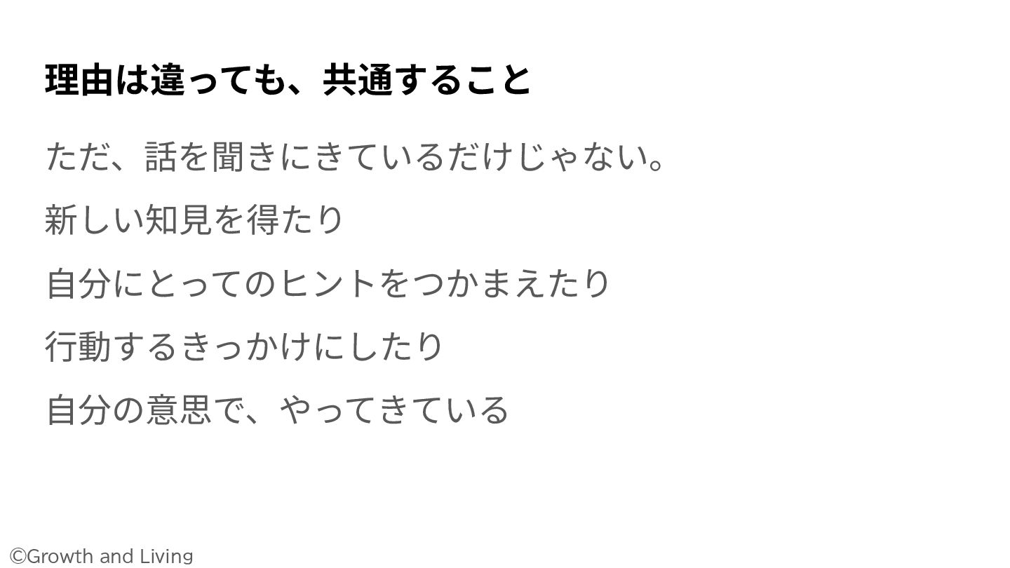 ©Growth and Living 理由は違っても、共通すること ただ、話を聞きにきているだけじゃない。 新しい知⾒を得たり ⾃分にとってのヒントをつかまえたり ⾏動するきっかけにしたり ⾃分の意思で、やってきている