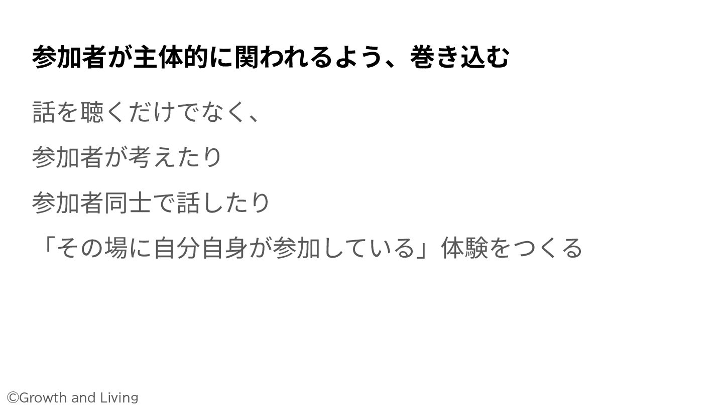 ©Growth and Living 参加者が主体的に関われるよう、巻き込む 話を聴くだけでなく、 参加者が考えたり 参加者同⼠で話したり 「その場に⾃分⾃⾝が参加している」体験をつくる