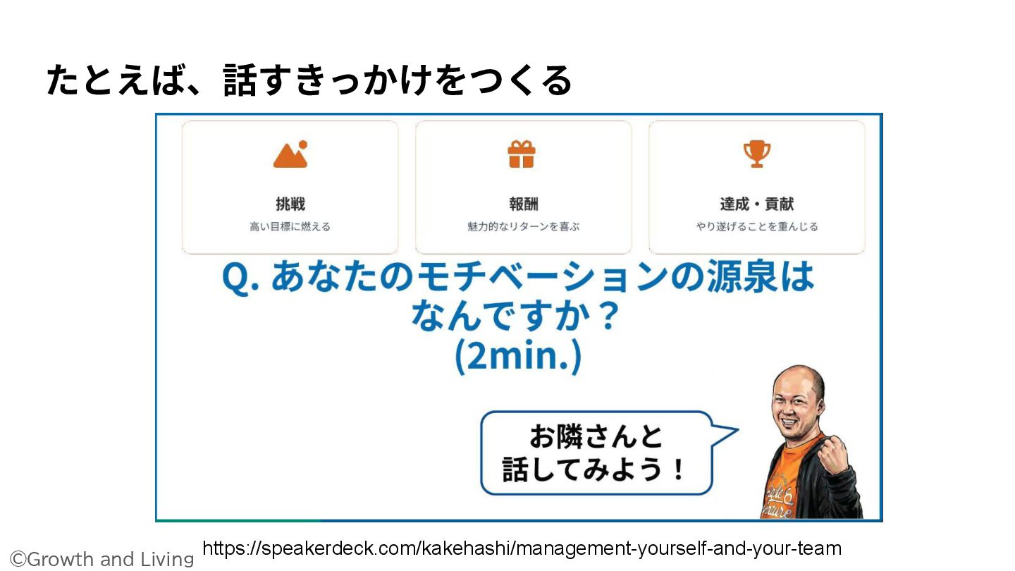 ©Growth and Living たとえば、話すきっかけをつくる https://speakerdeck.com/kakehashi/management-yourself-and-your-team