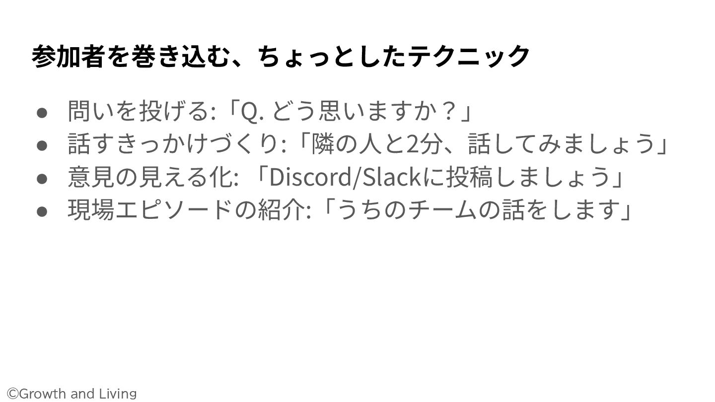 ©Growth and Living 参加者を巻き込む、ちょっとしたテクニック • 問いを投げる:「Q. どう思いますか?」 • 話すきっかけづくり:「隣の⼈と2分、話してみましょう」 •