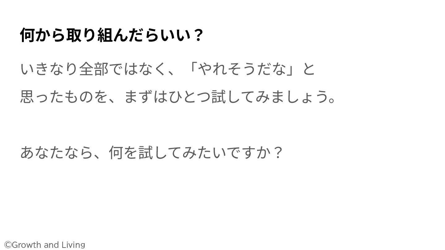 ©Growth and Living 何から取り組んだらいい? いきなり全部ではなく、「やれそうだな」と 思ったものを、まずはひとつ試してみましょう。 あなたなら、何を試してみたいですか?