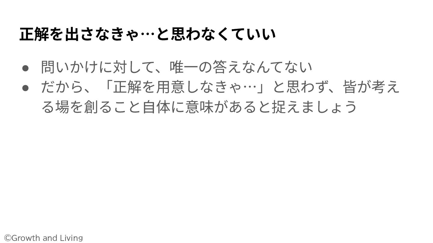 ©Growth and Living 正解を出さなきゃ…と思わなくていい • 問いかけに対して、唯⼀の答えなんてない • だから、「正解を⽤意しなきゃ…」と思わず、皆が考え る場を創ること⾃体に意味があると捉えましょう