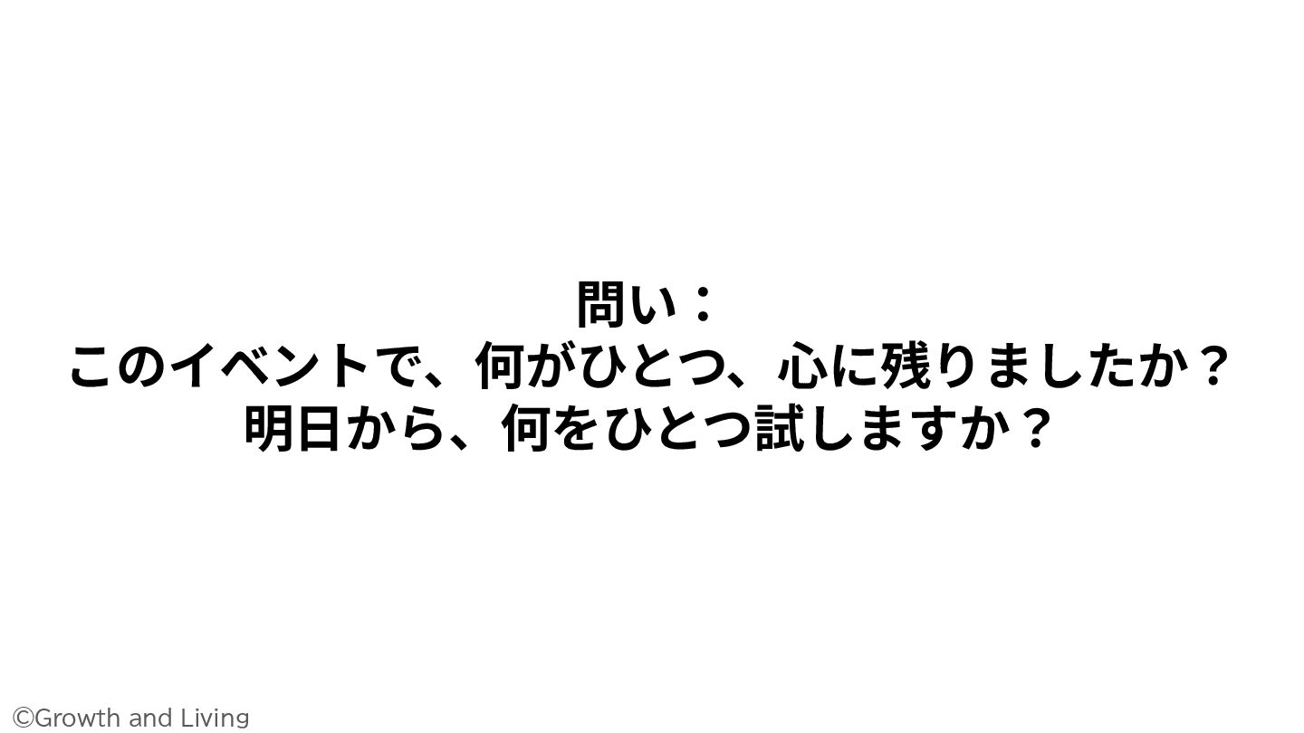 ©Growth and Living 問い: このイベントで、何がひとつ、⼼に残りましたか? 明⽇から、何をひとつ試しますか?