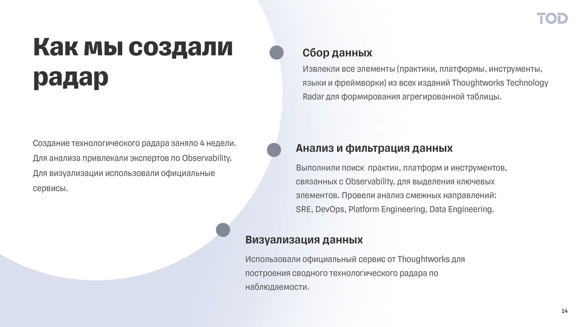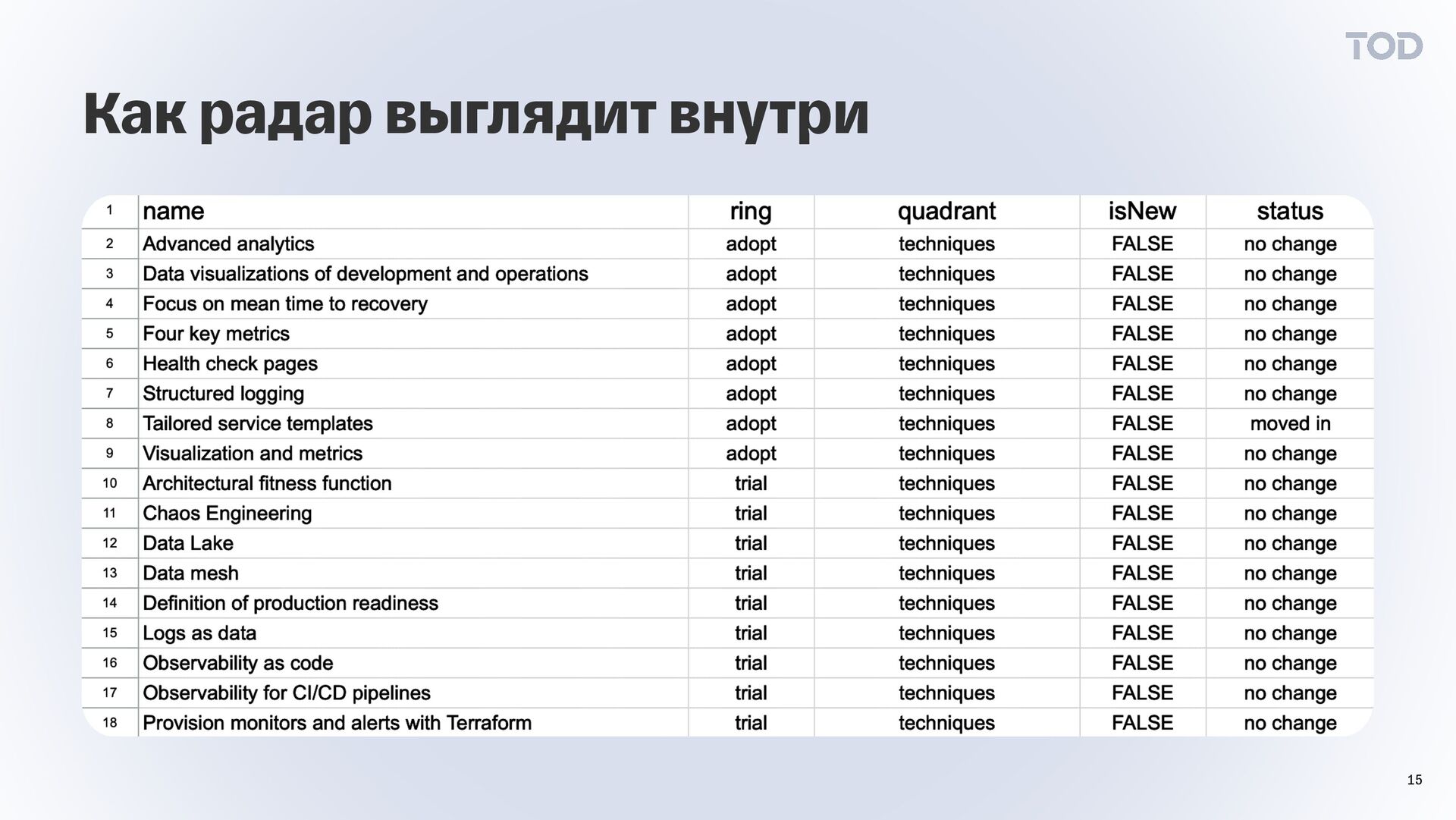 всех изданий Thoughtworks Technology Radar для формирования агрегированной таблицы. Сбор данных Выполнили поиск практик, платформ и инструментов, связанных с Observability, для выделения ключевых элементов. Провели анализ смежных направлений: SRE, DevOps, Platform Engineering, Data Engineering. Анализ и фильтрация данных Использовали официальный сервис от Thoughtworks для построения сводного технологического радара по наблюдаемости. Визуализация данных Как мы создали радар Создание технологического радара заняло 4 недели. Для анализа привлекали экспертов по Observability. Для визуализации использовали официальные сервисы. 14