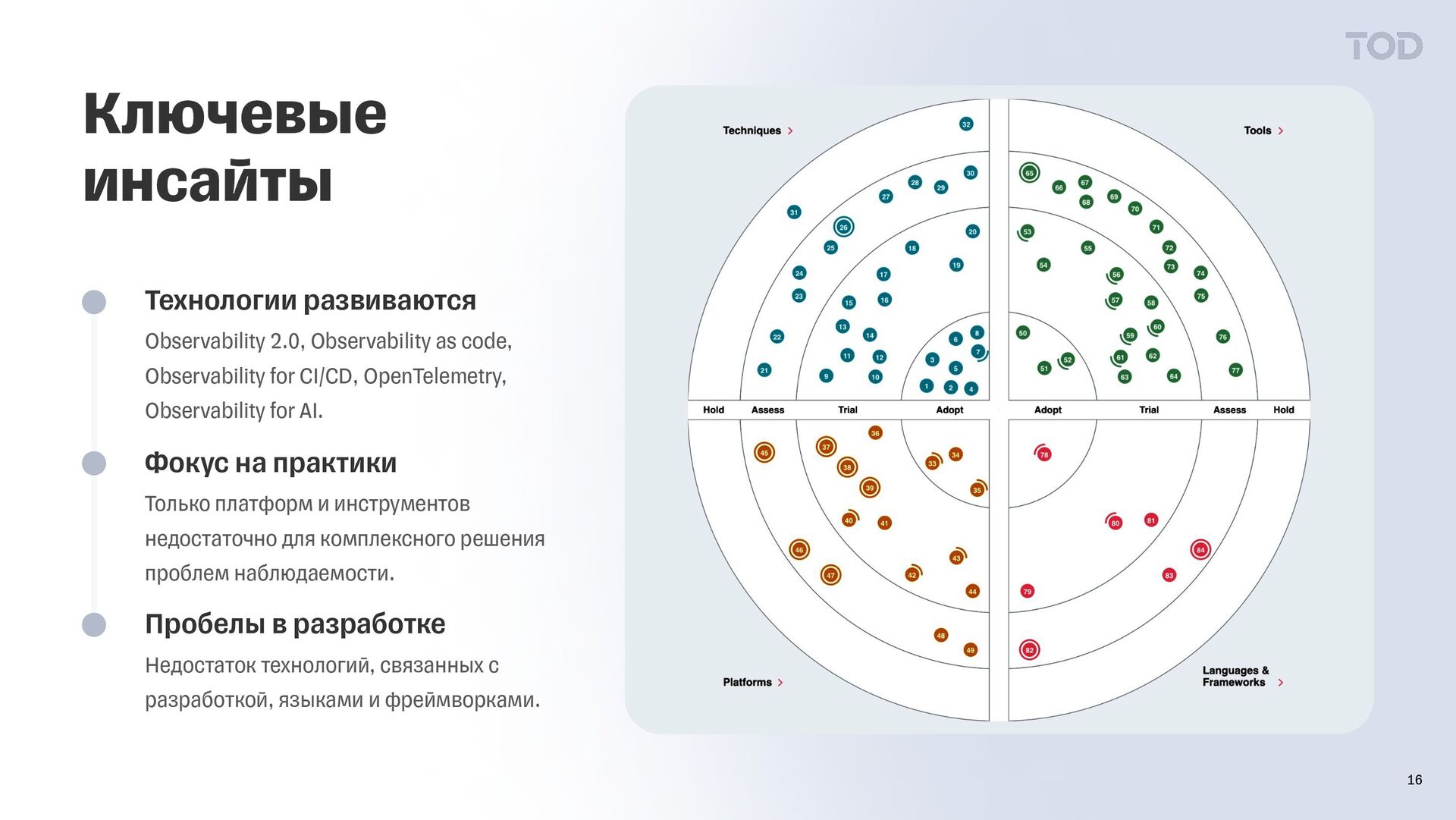 32 практики Сводный технологический радар по наблюдаемости охватывает 84 технологии, включая 32 практики, 17 платформ и 35 инструментов. Технологии находятся на разных уровнях зрелости: 15 в Adopt, 36 в Trial, 31 в Assess, 2 в Hold. 13