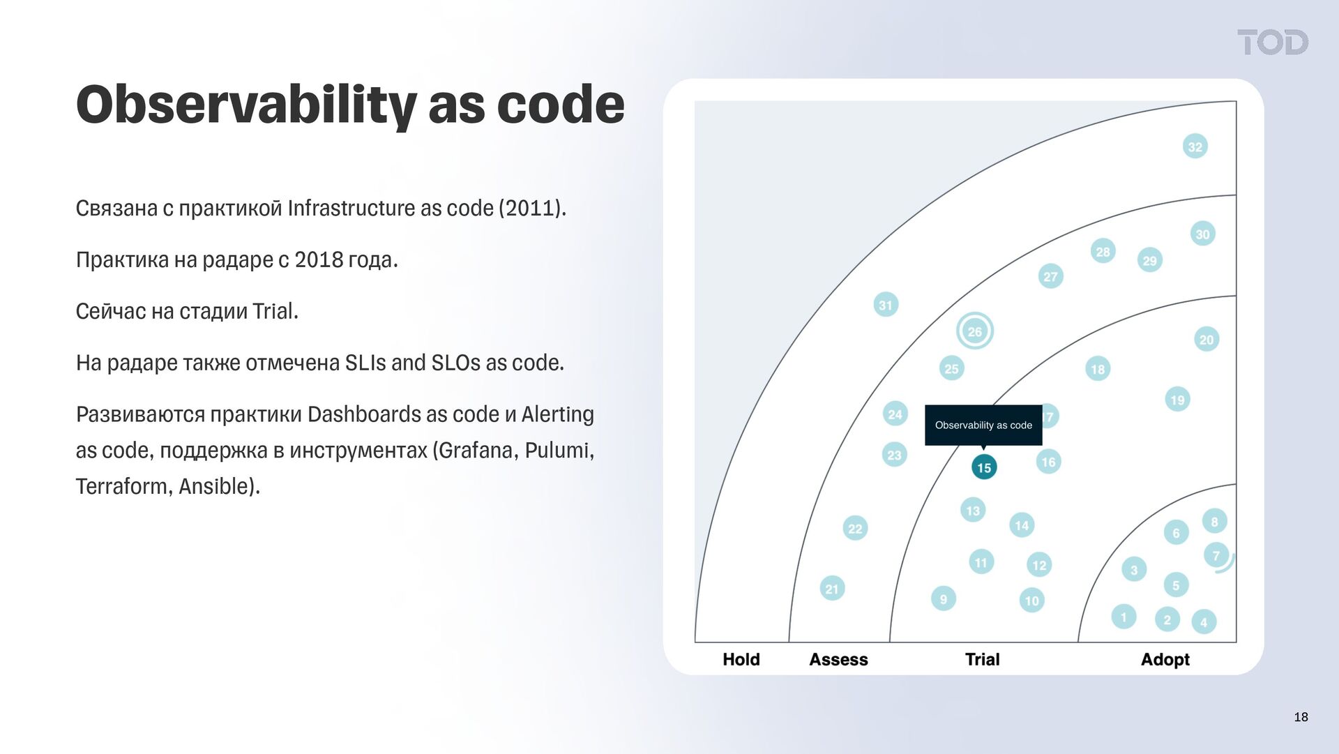 (2011). Практика на радаре с 2018 года. Сейчас на стадии Trial. На радаре также отмечена SLIs and SLOs as code. Развиваются практики Dashboards as code и Alerting as code, поддержка в инструментах (Grafana, Pulumi, Terraform, Ansible).