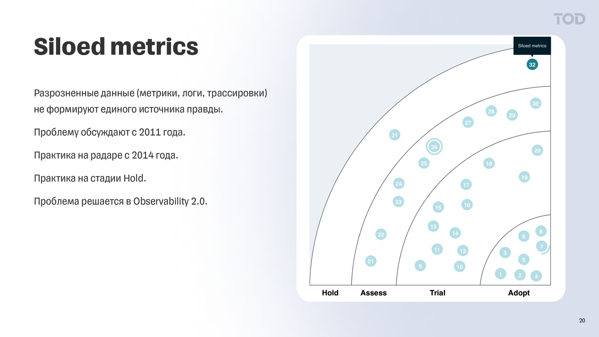 единого источника правды. Проблему обсуждают c 2011 года. Практика на радаре с 2014 года. Практика на стадии Hold. Проблема решается в Observability 2.0.