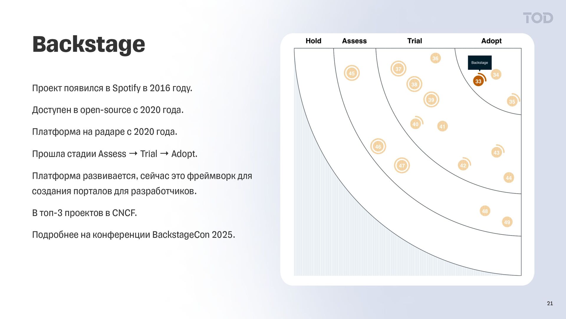 в open-source с 2020 года. Платформа на радаре с 2020 года. Прошла стадии Assess → Trial → Adopt. Платформа развивается, сейчас это фреймворк для создания порталов для разработчиков. В топ-3 проектов в CNCF. Подробнее на конференции BackstageCon 2025.