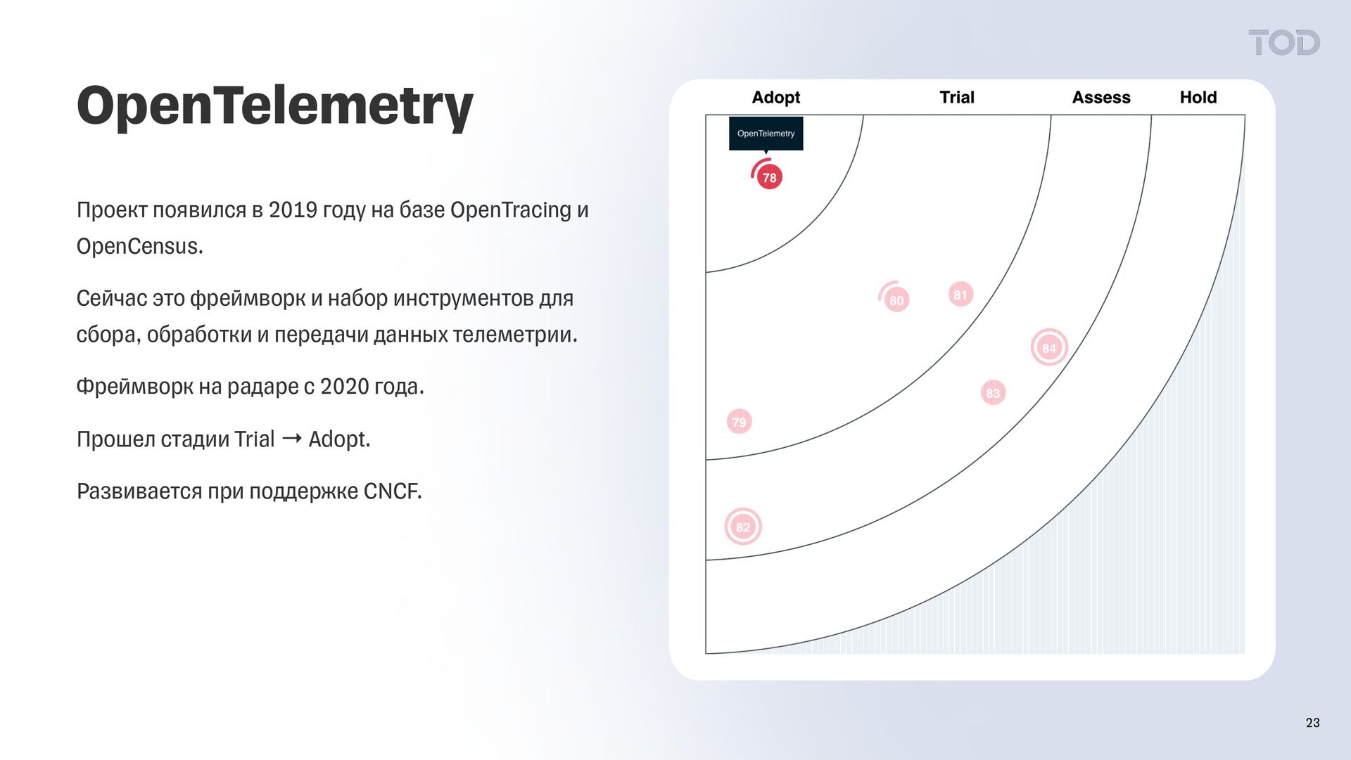 и OpenCensus. Сейчас это фреймворк и набор инструментов для сбора, обработки и передачи данных телеметрии. Фреймворк на радаре с 2020 года. Прошел стадии Trial → Adopt. Развивается при поддержке CNCF.