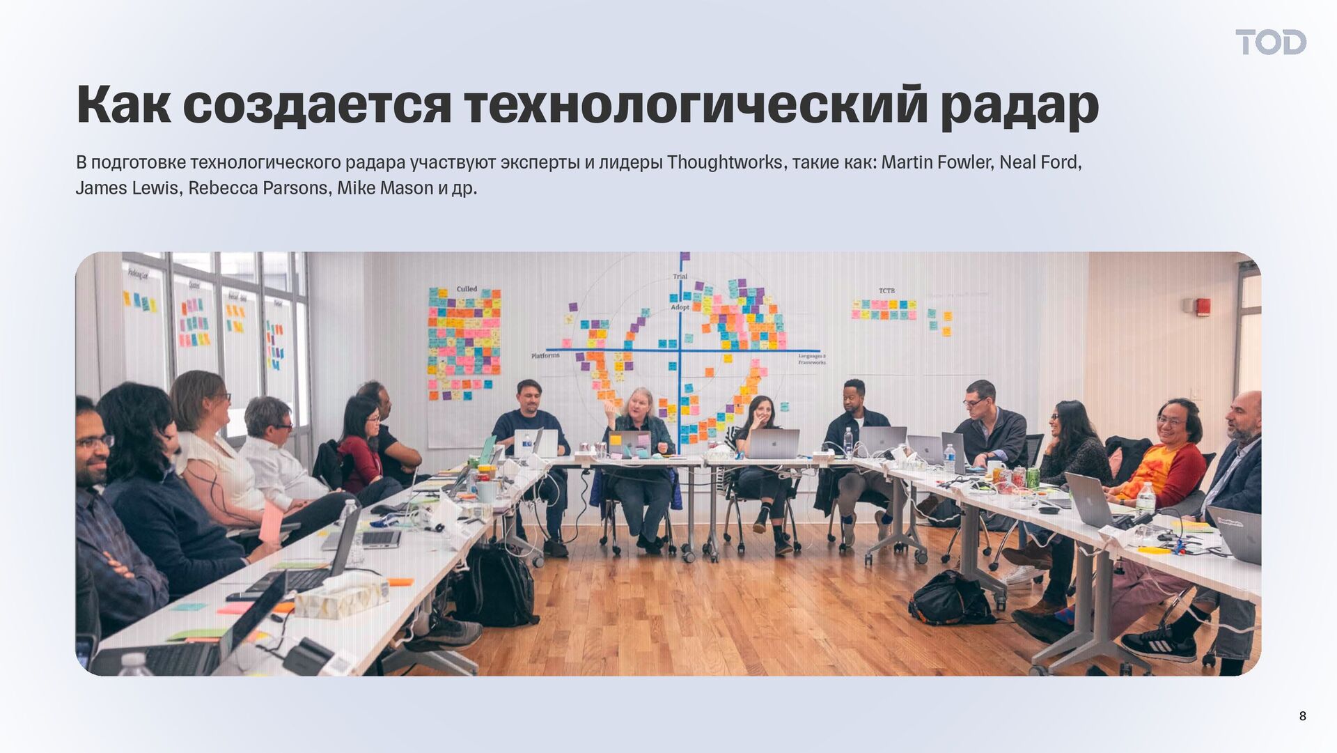 7 Жизненный цикл технологий описывает, как практики, платформы, инструменты, языки и фреймворки проходят через различные стадии зрелости и применимости, от появления до возможного устаревания. Перспективные технологии, проверяются в проектах. Зрелые и рекомендованные технологии. Технологии не рекомендуются или устарели. Новые технологии, требуют изучения и оценки.
