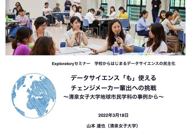 Exploratoryηϛφʔɹֶߍ͔Β͡·ΔσʔλαΠΤϯεͷຽओԽ σʔλαΠΤϯεʮʯ͑Δ νΣϯδϝʔΧʔഐग़ͷઓ ʙਗ਼ઘঁࢠେֶٿࢢຽֶՊͷࣄྫ͔Βʙ 20223݄18 ࢁຊ ୡʢਗ਼ઘঁࢠେֶʣ