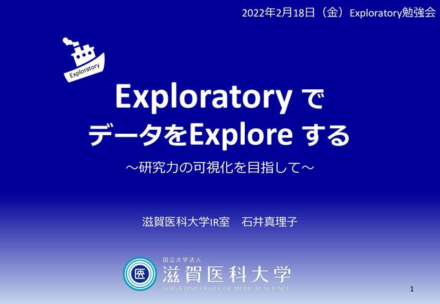 Exploratory で データをExplore する 〜研究⼒の可視化を⽬指して〜 滋賀医科⼤学IR室 ⽯井真理⼦ 2022年2⽉18⽇(⾦)Exploratory勉強会 Exploratory 1