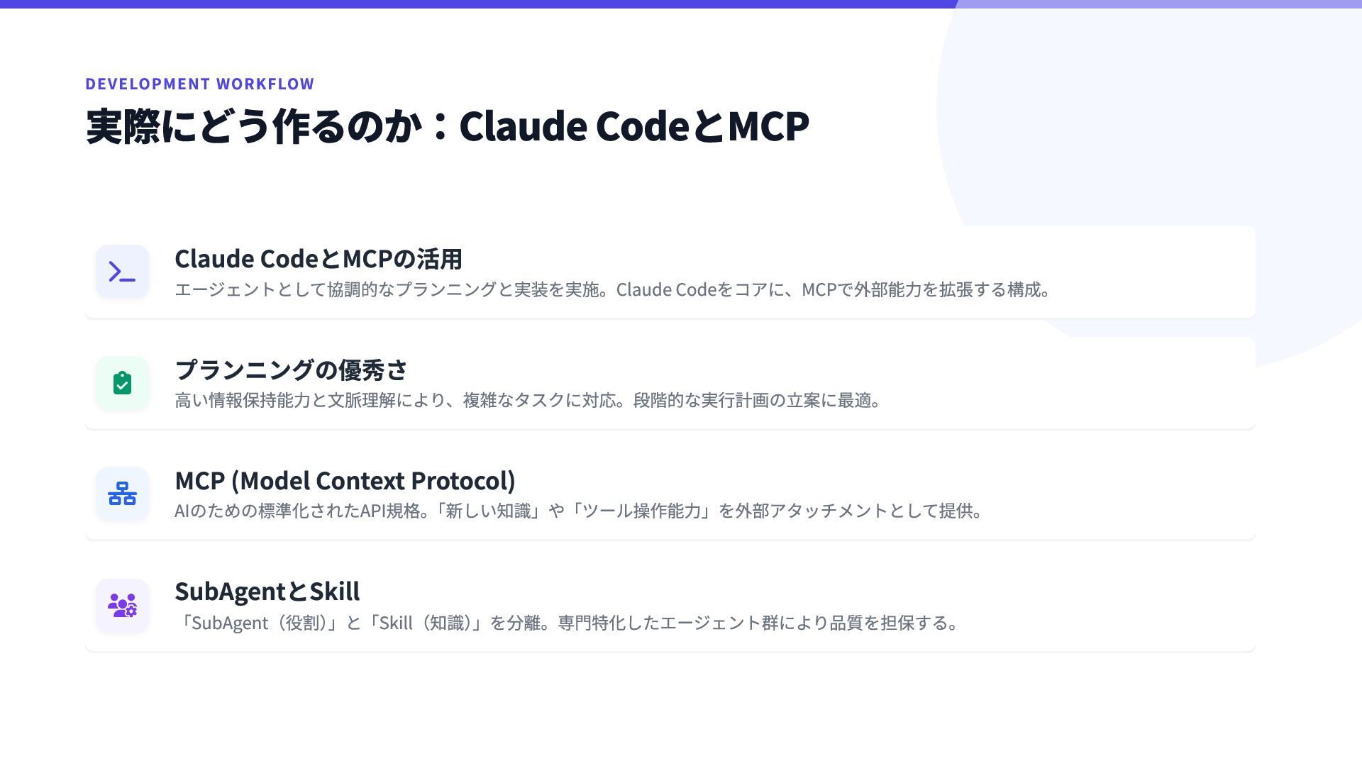 8. DEVELOPMENT WORKFLOW 実際にどう作るのか:Claude CodeとMCP  Claude CodeとMCPの活用 エージェントとして協調的なプランニングと実装を実施。Claude Codeをコアに、MCPで外部能力を拡張する構成。 