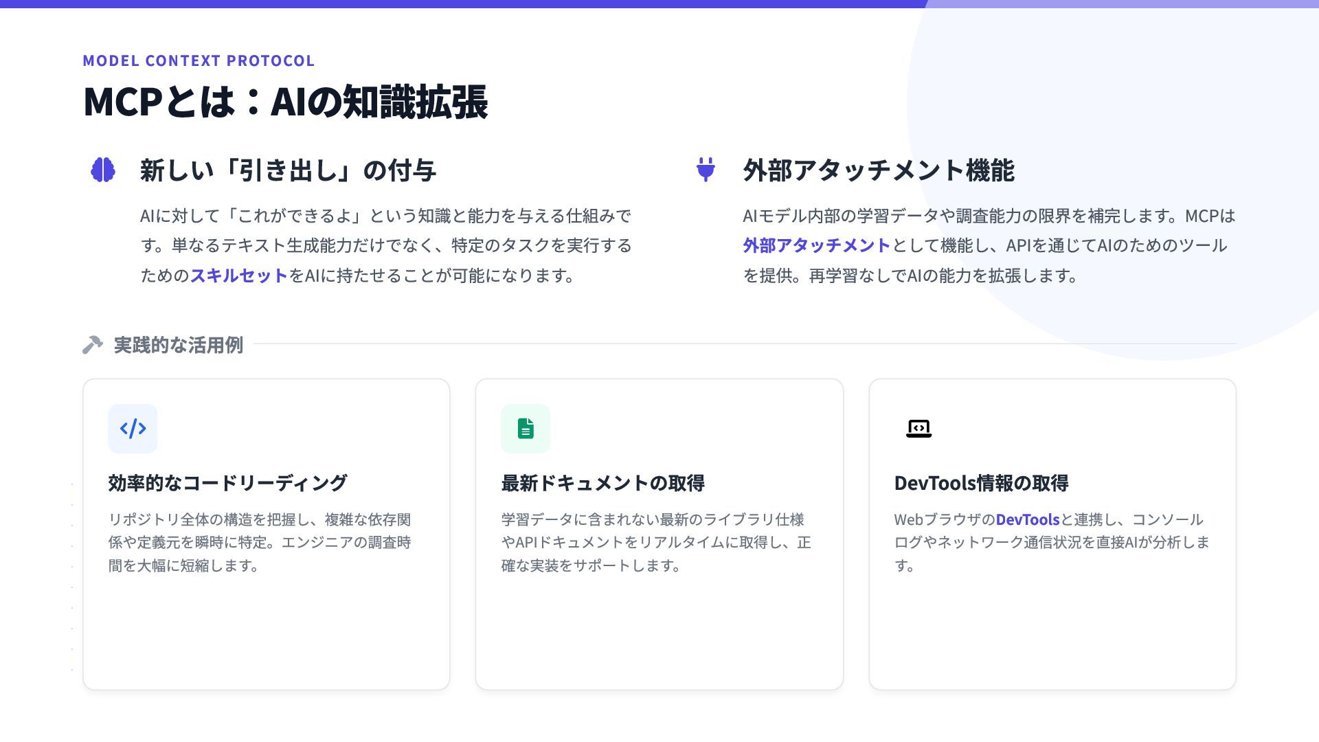 外部アタッチメント機能 AIモデル内部の学習データや調査能力の限界を補完します。MCPは 外部アタッチメントとして機能し、APIを通じてAIのためのツール を提供。再学習なしでAIの能力を拡張します。  実践的な活用例  効率的なコードリーディング リポジトリ全体の構造を把握し、複雑な依存関 係や定義元を瞬時に特定。エンジニアの調査時 間を大幅に短縮します。  最新ドキュメントの取得 学習データに含まれない最新のライブラリ仕様 やAPIドキュメントをリアルタイムに取得し、正 確な実装をサポートします。  DevTools情報の取得 WebブラウザのDevToolsと連携し、コンソール ログやネットワーク通信状況を直接AIが分析しま す。