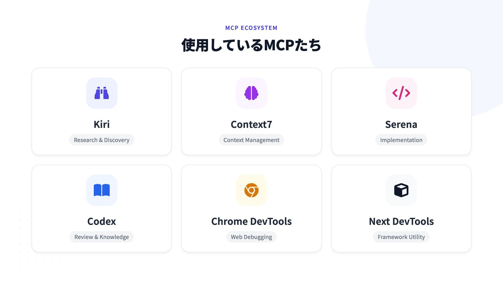 10. MCP ECOSYSTEM 使用しているMCPたち  Kiri Research & Discovery  Context7