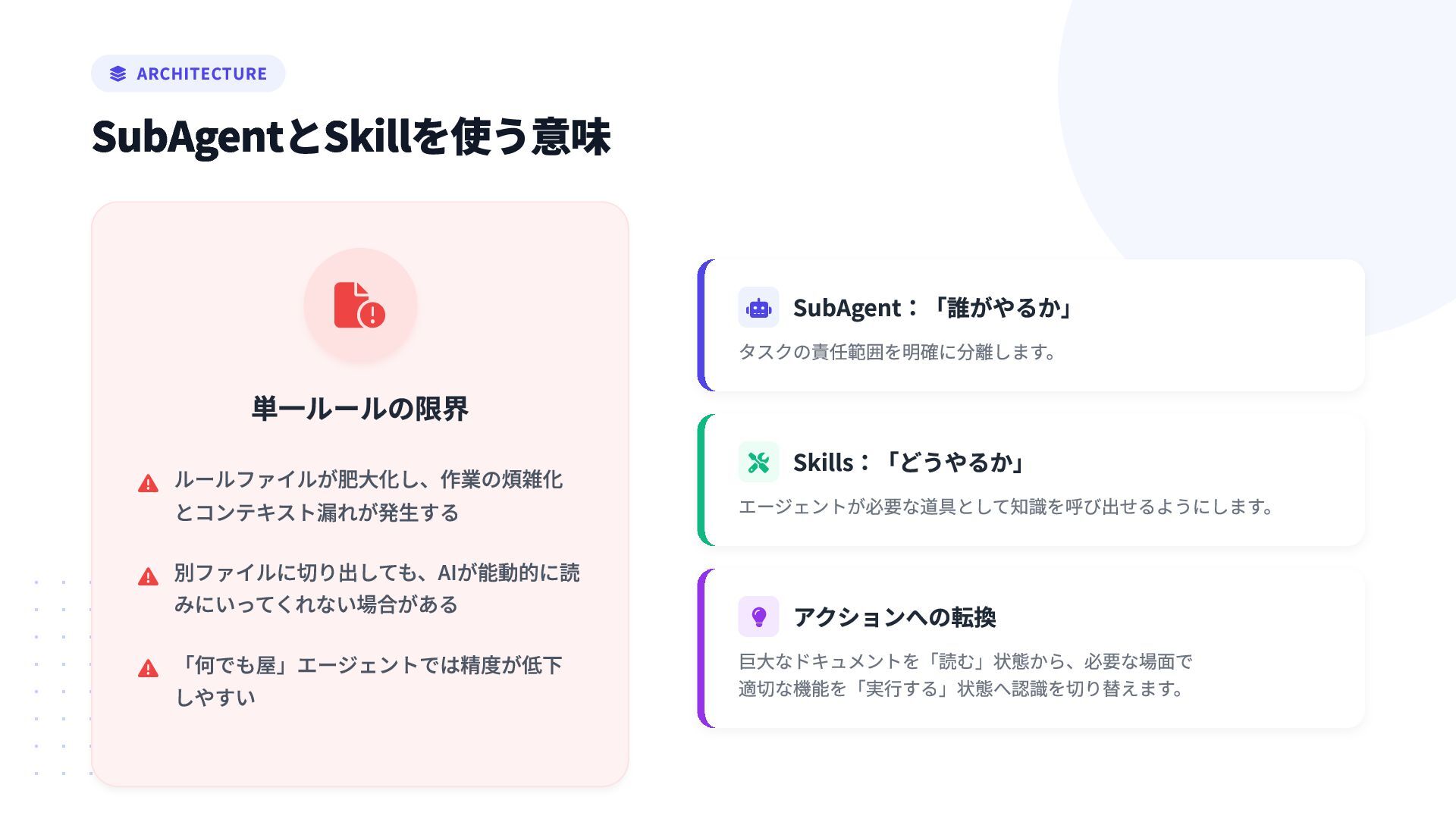 単一ルールの限界 ルールファイルが肥大化し、作業の煩雑化 とコンテキスト漏れが発生する  別ファイルに切り出しても、AIが能動的に読 みにいってくれない場合がある  「何でも屋」エージェントでは精度が低下 しやすい   ARCHITECTURE SubAgentとSkillを使う意味
