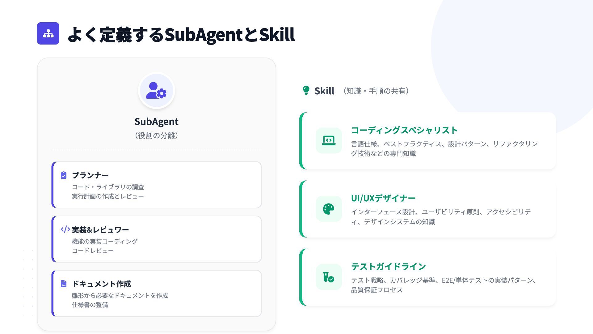 コードレビュー  ドキュメント作成 雛形から必要なドキュメントを作成 仕様書の整備  Skill (知識・手順の共有)  コーディングスペシャリスト 言語仕様、ベストプラクティス、設計パターン、リファクタリン グ技術などの専門知識  UI/UXデザイナー インターフェース設計、ユーザビリティ原則、アクセシビリテ ィ、デザインシステムの知識  テストガイドライン テスト戦略、カバレッジ基準、E2E/単体テストの実装パターン、 品質保証プロセス  よく定義するSubAgentとSkill