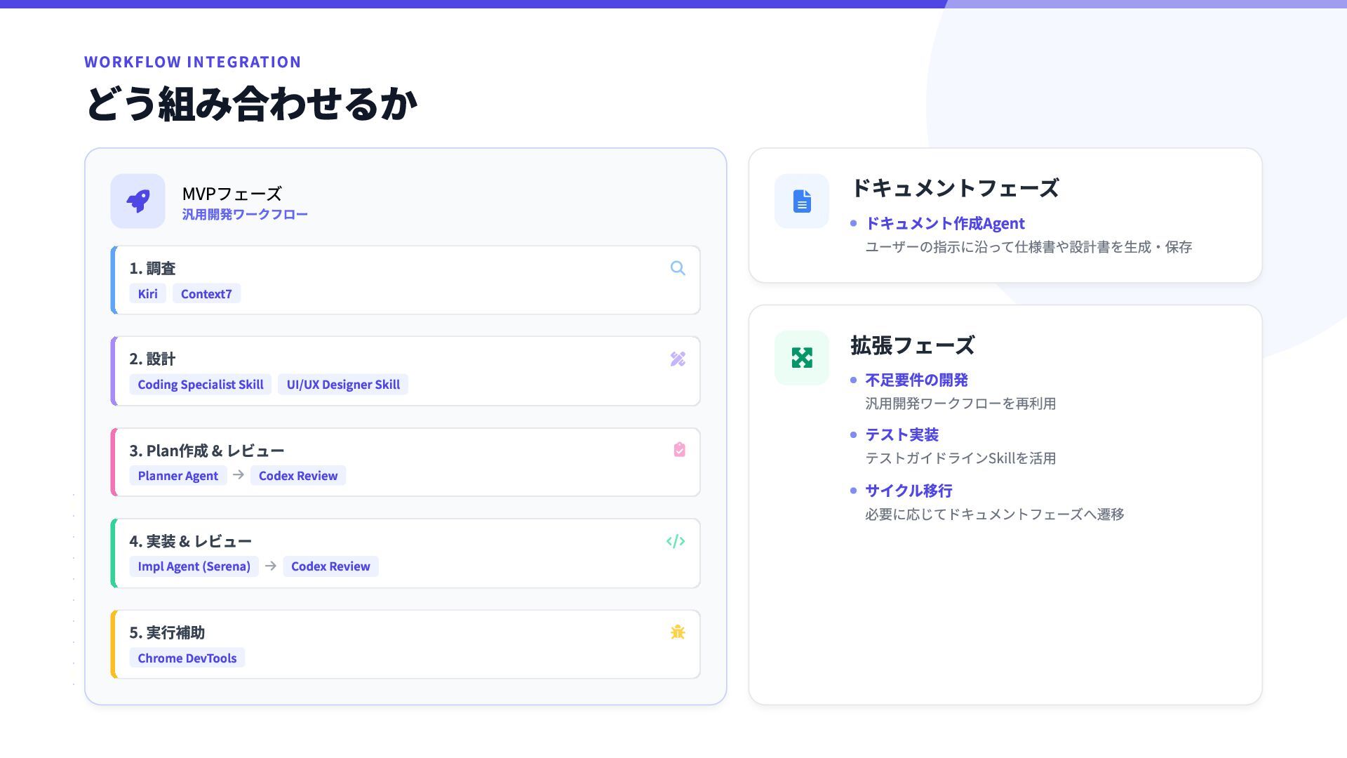 13. WORKFLOW INTEGRATION どう組み合わせるか  MVPフェーズ 汎用開発ワークフロー 1. 調査  Kiri