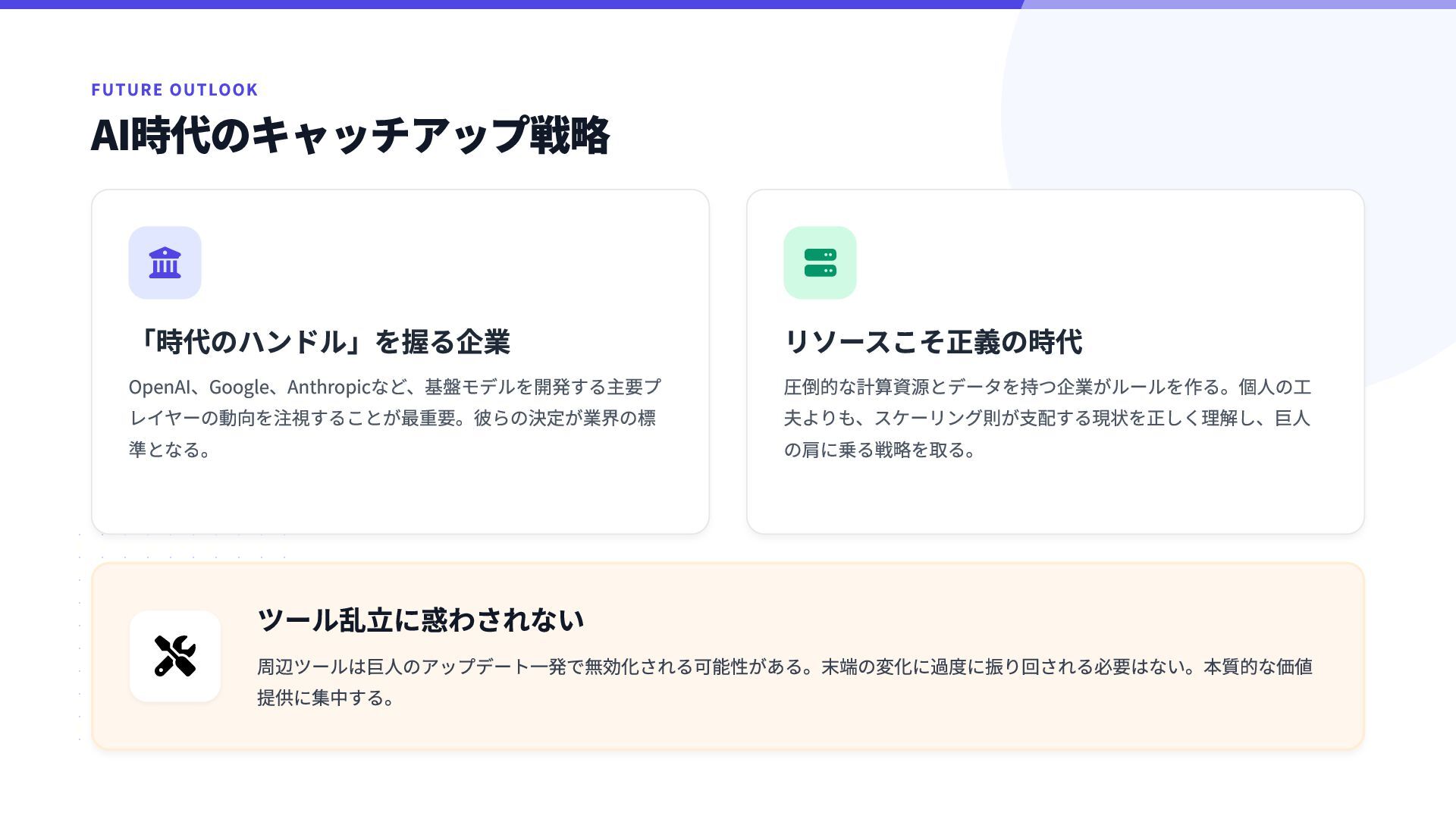 圧倒的な計算資源とデータを持つ企業がルールを作る。個人の工 夫よりも、スケーリング則が支配する現状を正しく理解し、巨人 の肩に乗る戦略を取る。  ツール乱立に惑わされない 周辺ツールは巨人のアップデート一発で無効化される可能性がある。末端の変化に過度に振り回される必要はない。本質的な価値 提供に集中する。