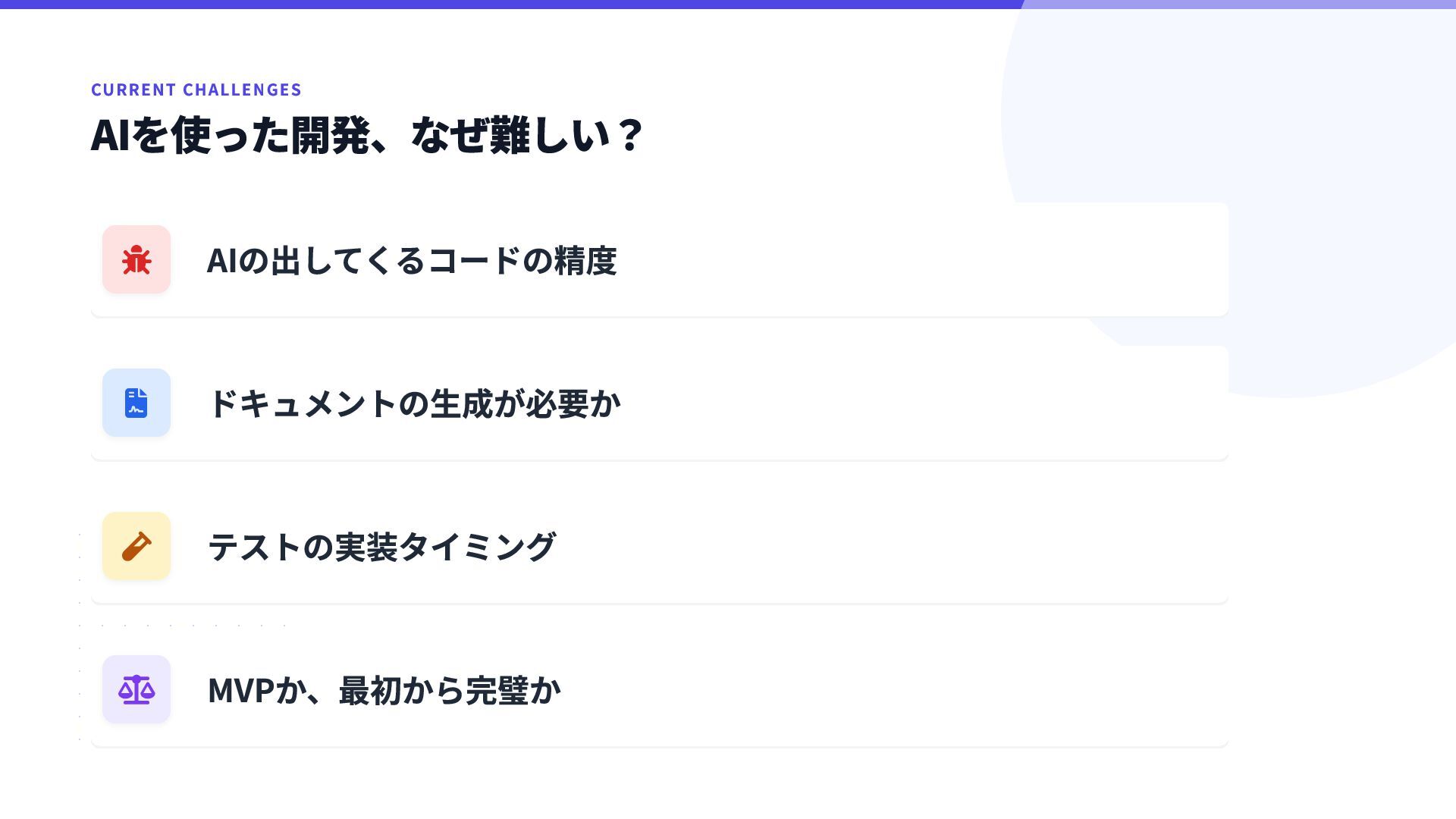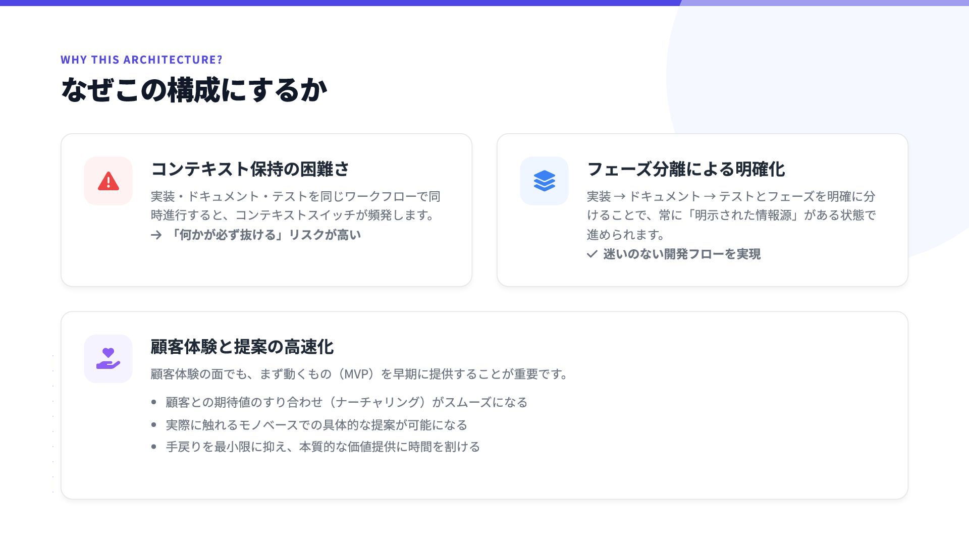  フェーズ分離による明確化 実装 → ドキュメント → テストとフェーズを明確に分 けることで、常に「明示された情報源」がある状態で 進められます。  迷いのない開発フローを実現  顧客体験と提案の高速化 顧客体験の面でも、まず動くもの(MVP)を早期に提供することが重要です。 顧客との期待値のすり合わせ(ナーチャリング)がスムーズになる 実際に触れるモノベースでの具体的な提案が可能になる 手戻りを最小限に抑え、本質的な価値提供に時間を割ける