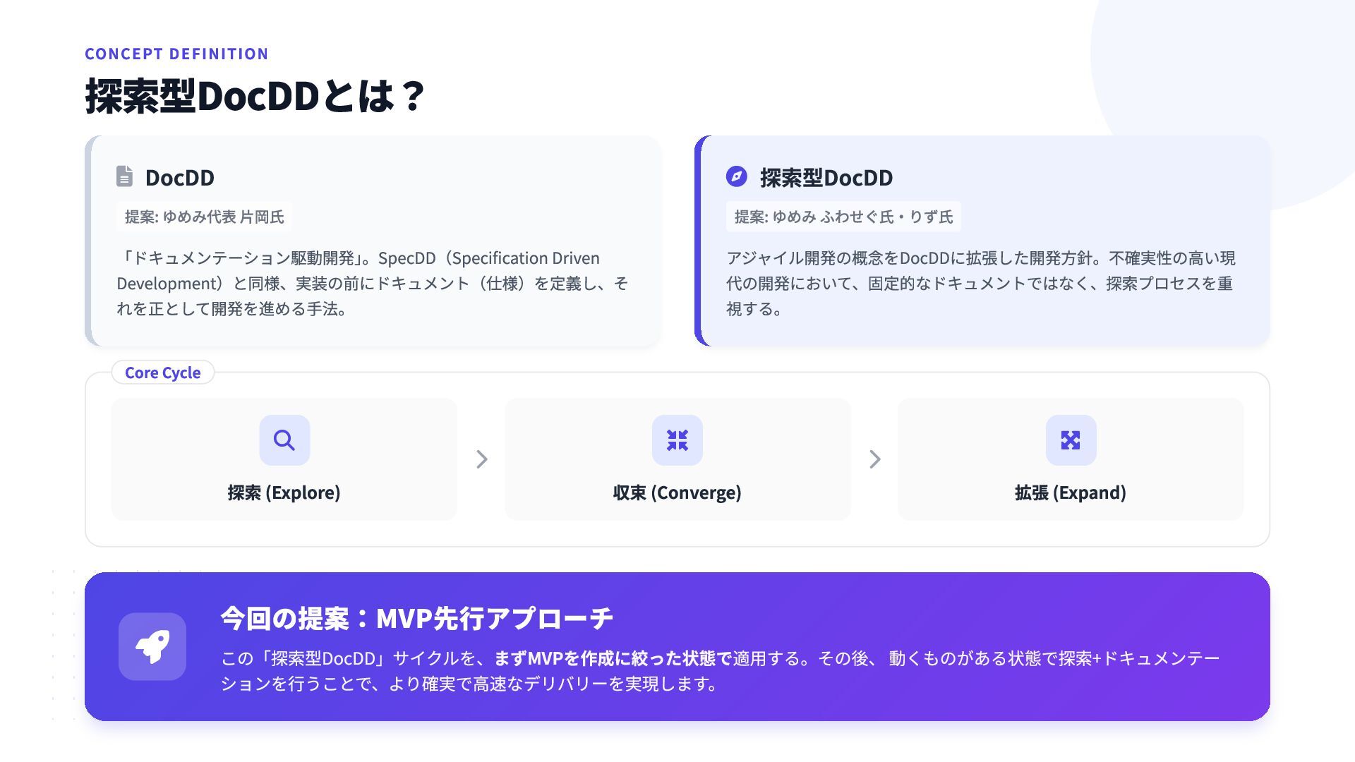 Driven Development)と同様、実装の前にドキュメント(仕様)を定義し、そ れを正として開発を進める手法。  探索型DocDD 提案: ゆめみ ふわせぐ氏・りず氏 アジャイル開発の概念をDocDDに拡張した開発方針。不確実性の高い現 代の開発において、固定的なドキュメントではなく、探索プロセスを重 視する。  今回の提案:MVP先行アプローチ  探索 (Explore)   収束 (Converge)   拡張 (Expand) Core Cycle この「探索型DocDD」サイクルを、まずMVPを作成に絞った状態で適用する。その後、 動くものがある状態で探索+ドキュメンテー ションを行うことで、より確実で高速なデリバリーを実現します。