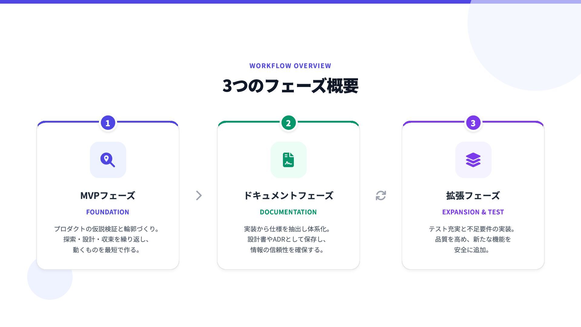 動くものを最短で作る。 1  ドキュメントフェーズ DOCUMENTATION 実装から仕様を抽出し体系化。 設計書やADRとして保存し、 情報の信頼性を確保する。 2  拡張フェーズ EXPANSION & TEST テスト充実と不足要件の実装。 品質を高め、新たな機能を 安全に追加。 3
