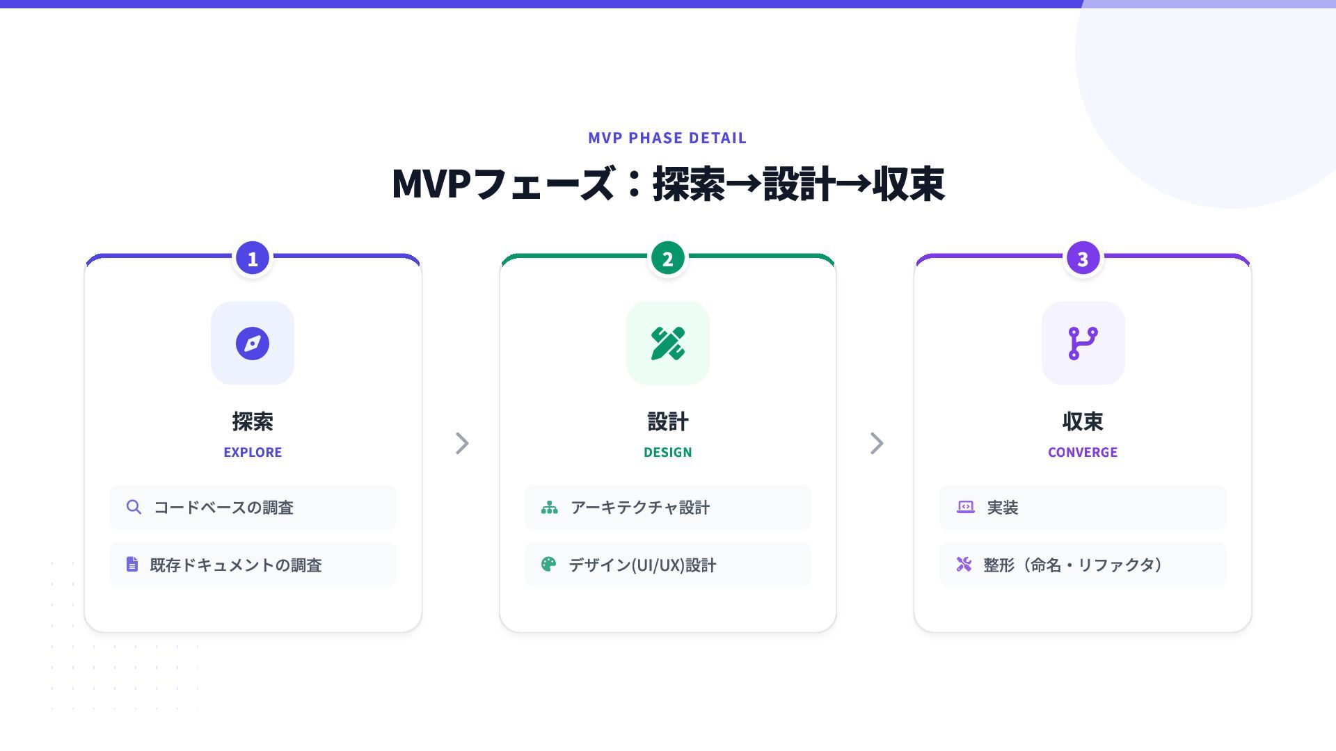 4. MVP PHASE DETAIL MVPフェーズ:探索→設計→収束    探索 EXPLORE コードベースの調査