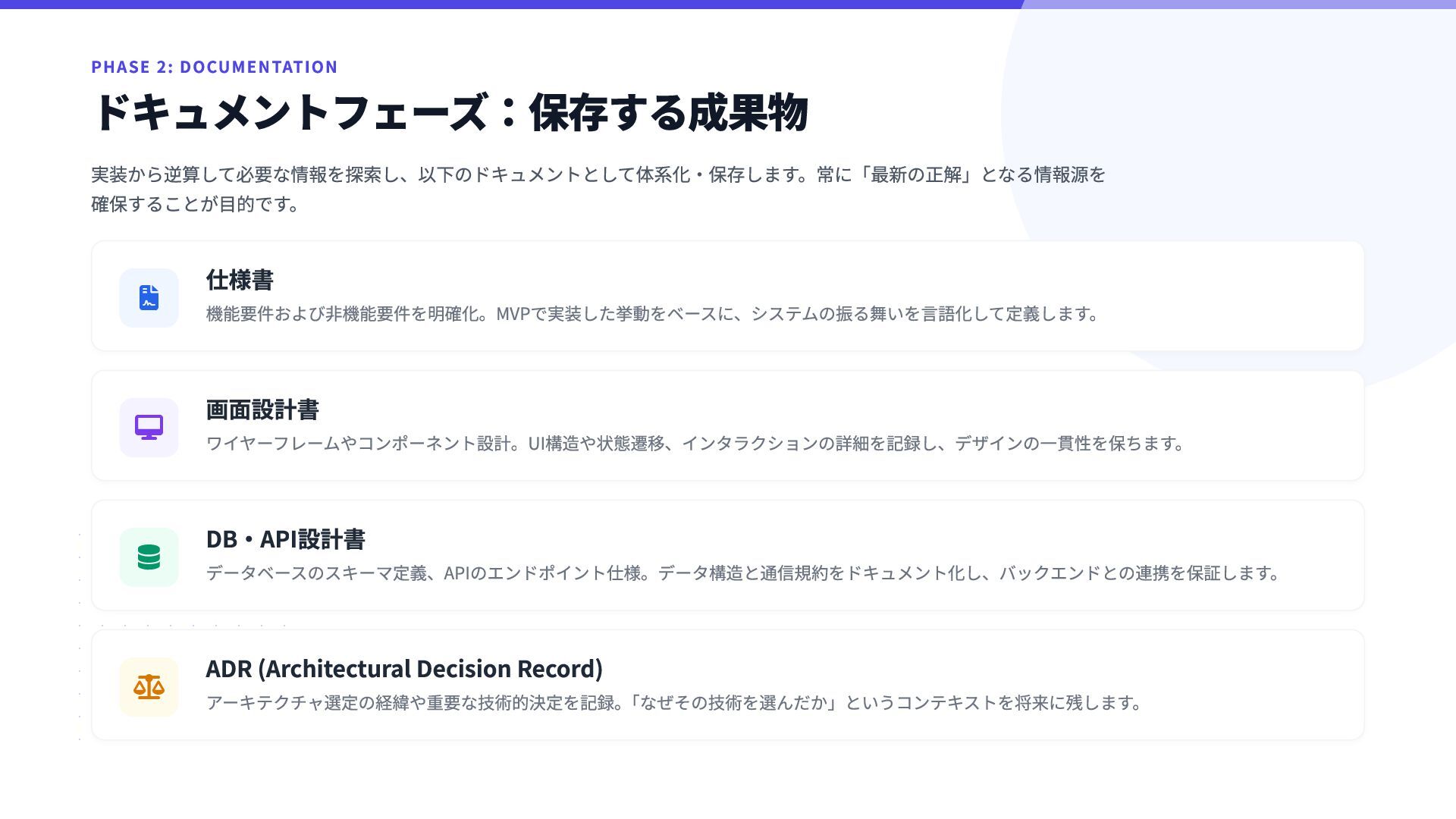 5. PHASE 2: DOCUMENTATION ドキュメントフェーズ:保存する成果物 実装から逆算して必要な情報を探索し、以下のドキュメントとして体系化・保存します。常に「最新の正解」となる情報源を 確保することが目的です。  仕様書 機能要件および非機能要件を明確化。MVPで実装した挙動をベースに、システムの振る舞いを言語化して定義します。 