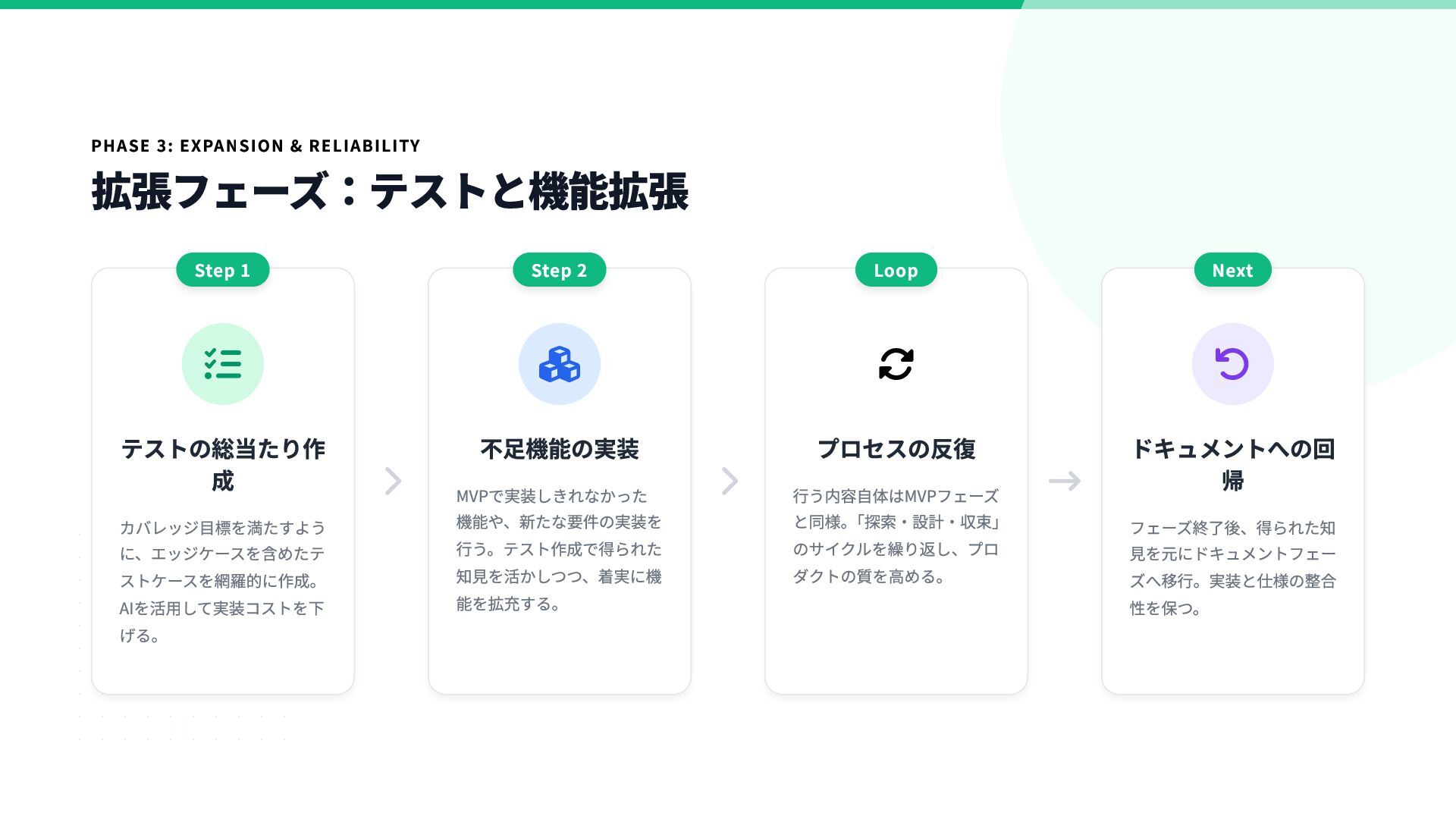 テストの総当たり作 成 カバレッジ目標を満たすよう に、エッジケースを含めたテ ストケースを網羅的に作成。 AIを活用して実装コストを下 げる。 Step 1  不足機能の実装 MVPで実装しきれなかった 機能や、新たな要件の実装を 行う。テスト作成で得られた 知見を活かしつつ、着実に機 能を拡充する。 Step 2  プロセスの反復 行う内容自体はMVPフェーズ と同様。 「探索・設計・収束」 のサイクルを繰り返し、プロ ダクトの質を高める。 Loop  ドキュメントへの回 帰 フェーズ終了後、得られた知 見を元にドキュメントフェー ズへ移行。実装と仕様の整合 性を保つ。 Next