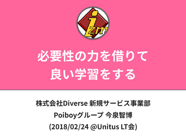 必要性の⼒を借りて 良い学習をする 株式会社Diverse 新規サービス事業部 Poiboyグループ 今泉智博 (2018/02/24 @Unitus LT会)