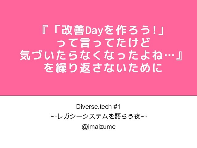 『「改善Dayを作ろう!」 って言ってたけど 気づいたらなくなったよね…』 を繰り返さないために Diverse.tech #1 〜レガシーシステムを語らう夜〜 @imaizume