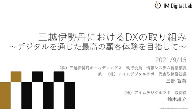 2021年9月15日に開催されたウェビナー「Beyond Retail CX 2021 流通・小売業における新しい顧客体験」での講演「三越伊勢丹におけるDXの取り組み〜デジタルを通じた最高の顧客体験を目指して〜」の資料です。