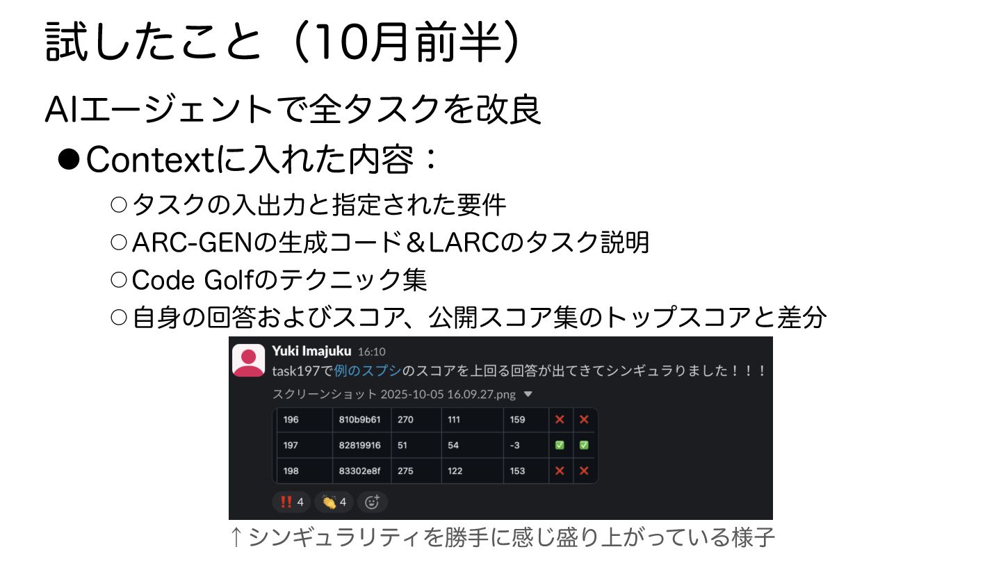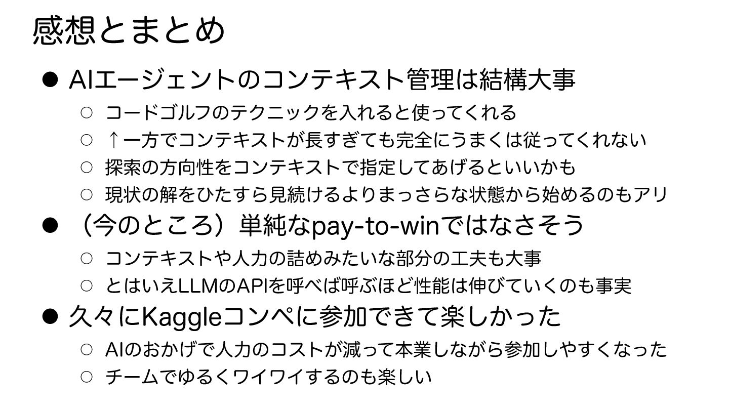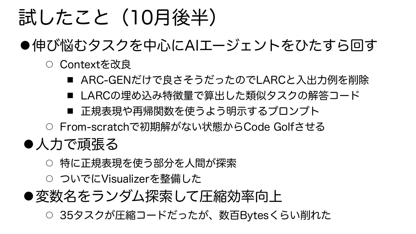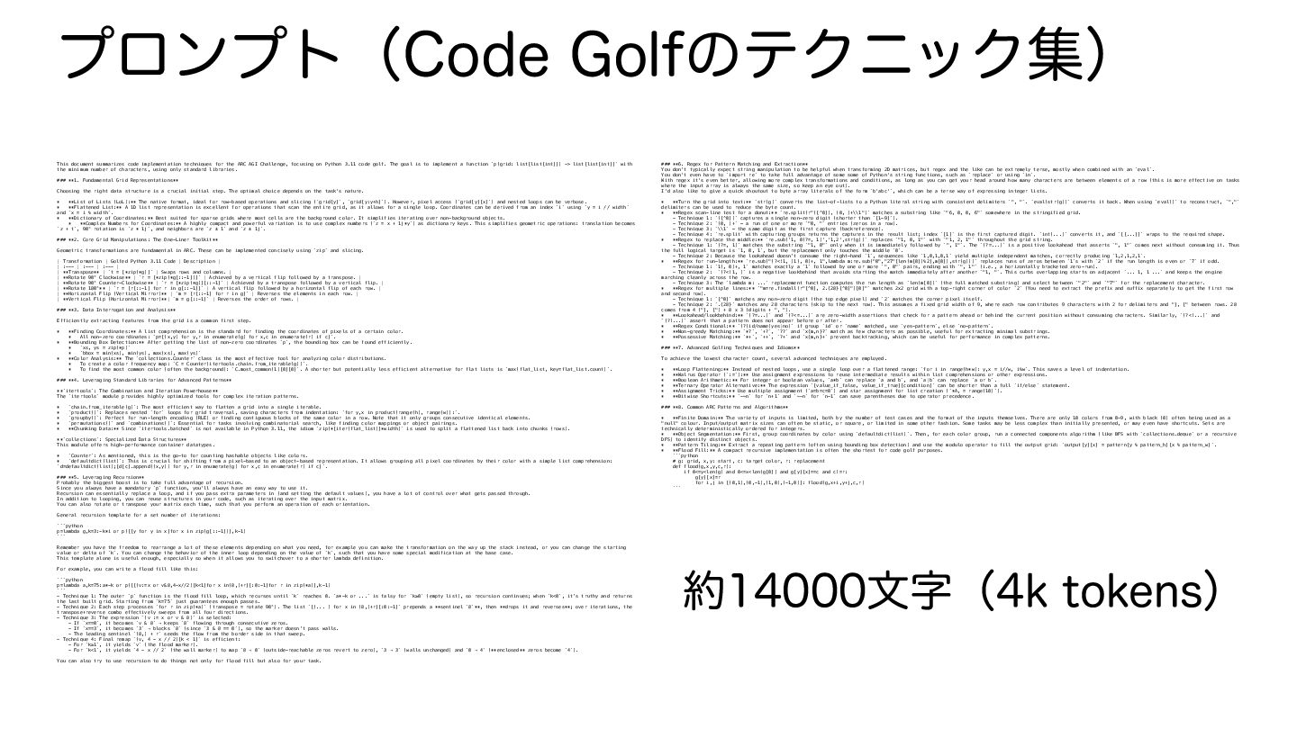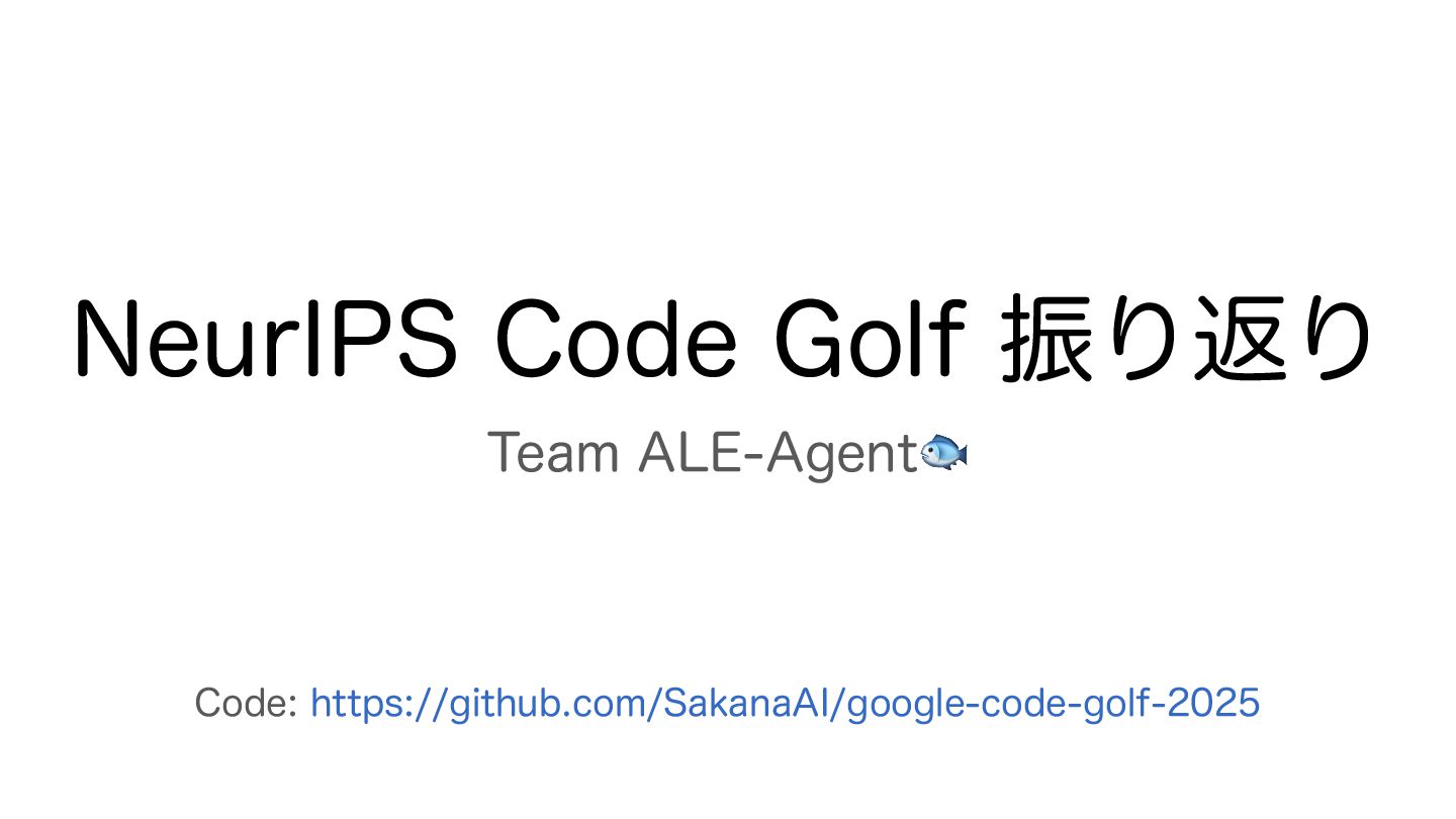 2025年11月27日に行われたMAP, Jigsaw, Code Golf 振り返り会 by 関東Kaggler会 (https://kanto-kaggler.connpass.com/event/375336/) にて発表した、NeurIPS 2025 - Google Code Golf Championship (https://www.kaggle.com/competitions/google-code-golf-2025) の振り返り資料です。