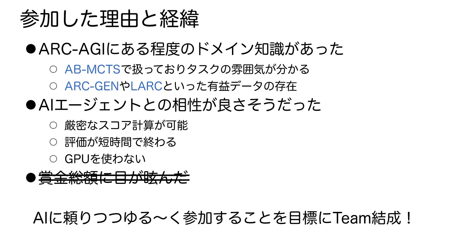 1. ࢀՃͨ͠ཧ༝ͱܦҢ ⚫︎ "3$"(*ʹ͋Δఔ౓ͷυϝΠϯ஌͕ࣝ͋ͬͨ ⚪︎ "#.$54Ͱѻ͓ͬͯΓλεΫͷงғؾ͕෼͔Δ ⚪︎ "3$(&/΍-"3$ͱ͍ͬͨ༗ӹσʔλͷଘࡏ ⚫︎ "*ΤʔδΣϯτͱͷ૬ੑ͕ྑͦ͞͏ͩͬͨ ⚪︎