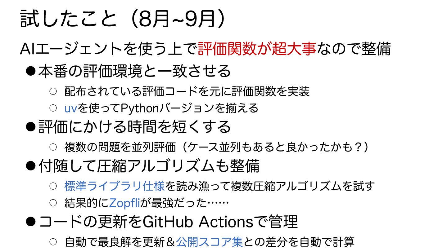 ⚪︎ ෳ਺ͷ໰୊ΛฒྻධՁʢέʔεฒྻ΋͋Δͱྑ͔͔ͬͨ΋ʁʣ ⚫︎ ෇ਵͯ͠ѹॖΞϧΰϦζϜ΋੔උ ⚪︎ ඪ४ϥΠϒϥϦ࢓༷ΛಡΈړͬͯෳ਺ѹॖΞϧΰϦζϜΛࢼ͢ ⚪︎ ݁Ռతʹ;PQGMJ͕࠷ڧͩͬͨʜʜ ⚫︎ ίʔυͷߋ৽Λ(JU)VC"DUJPOTͰ؅ཧ ⚪︎ ࣗಈͰ࠷ྑղΛߋ৽ˍެ։είΞूͱͷࠩ෼ΛࣗಈͰܭࢉ