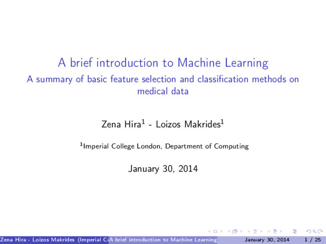 feature selection and classification methods on medical data Zena Hira1 - Loizos Makrides1 1Imperial College London, Department of Computing January 30, 2014 Zena Hira - Loizos Makrides (Imperial College London) A brief introduction to Machine Learning January 30, 2014 1 / 25