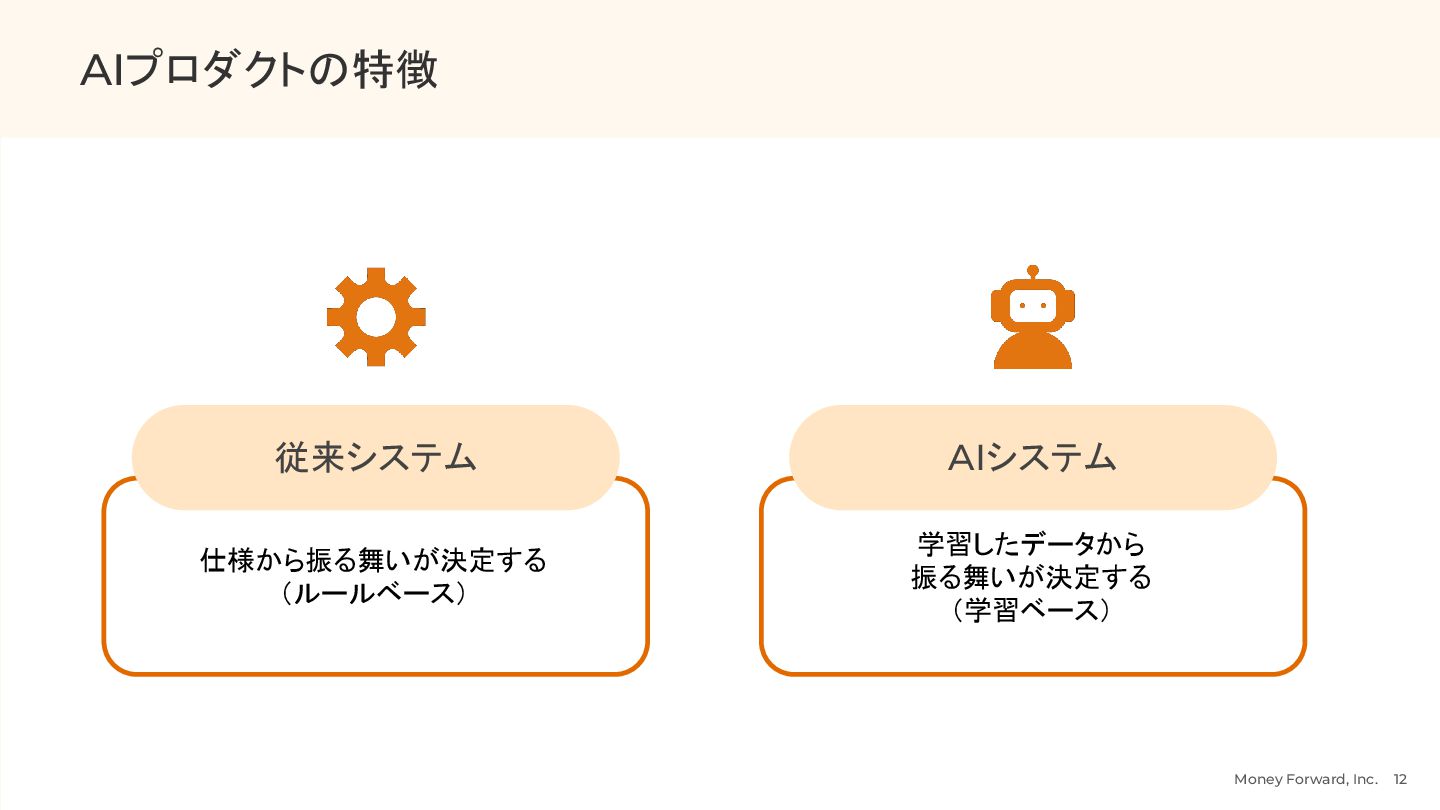 Money Forward, Inc. 12 学習したデータから 振る舞いが決定する (学習ベース) 仕様から振る舞いが決定する (ルールベース) AIプロダクトの特徴