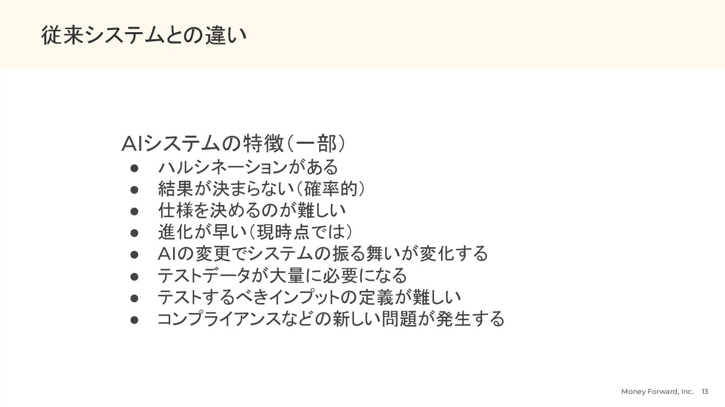 • 仕様を決めるのが難しい • 進化が早い(現時点では) • AIの変更でシステムの振る舞いが変化する • テストデータが大量に必要になる • テストするべきインプットの定義が難しい • コンプライアンスなどの新しい問題が発生する