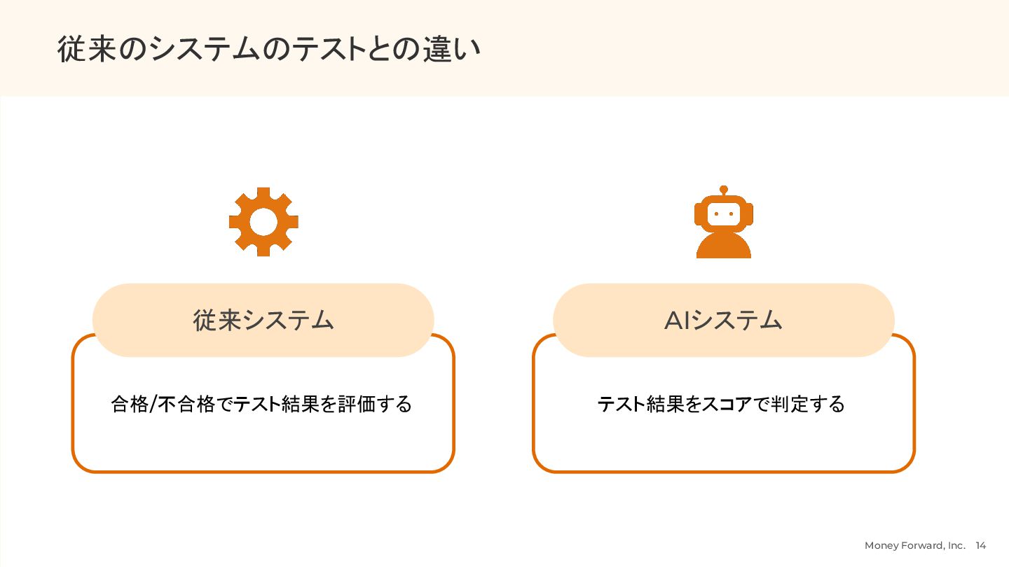 Money Forward, Inc. 14 従来のシステムのテストとの違い テスト結果をスコアで判定する 合格/不合格でテスト結果を評価する 従来システム AIシステム